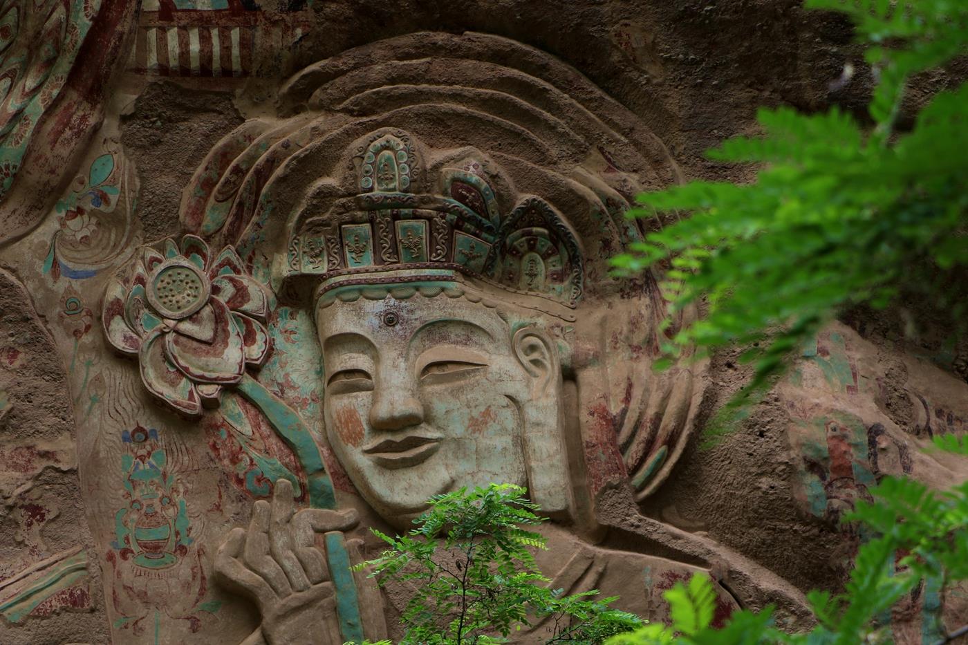 拉梢寺石窟是水帘洞石窟群中最璀璨的部分,始建于北周时期,历经唐、宋、元、明、清各朝,前后有一千多年的历史,世界第一摩崖大佛就坐落于此。拉梢寺的名称由来于它的建造方式有关,当年修建时,工匠们“拉梢登高,层累而上”,砍尽北山树木,从崖脚依次积木至山顶,随着工程的进展,再逐次拆木而成。也有学者认为,拉梢寺之名来源于藏语,意思是“神仙居住的地方”。观景台是观看拉梢寺的最佳位置, 1整个拉稍寺是主要分为南北两区,北区是在高宽各60余米,略做平整,前倾的崖面上做成。对面的北区,始建于公元559年,也就是北周明帝三年,距今已有1400多年的历史。崖面塑有一佛二菩萨,均为石胎泥塑。中间的是佛祖释迦牟尼,左右两侧为两尊胁侍菩萨,分别是文殊和普贤,三尊塑像被称为“华严三圣”。