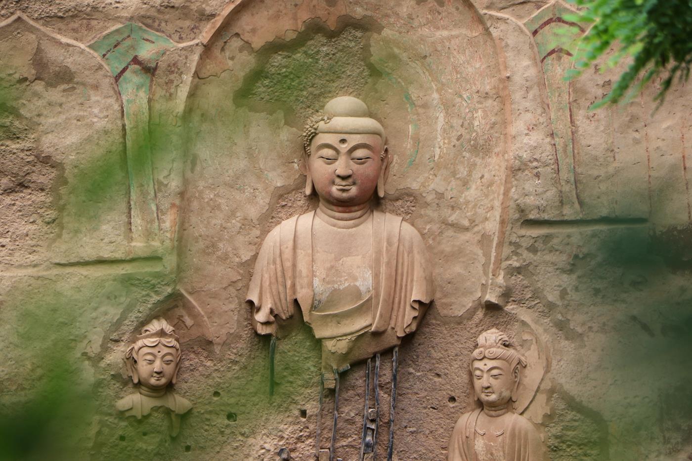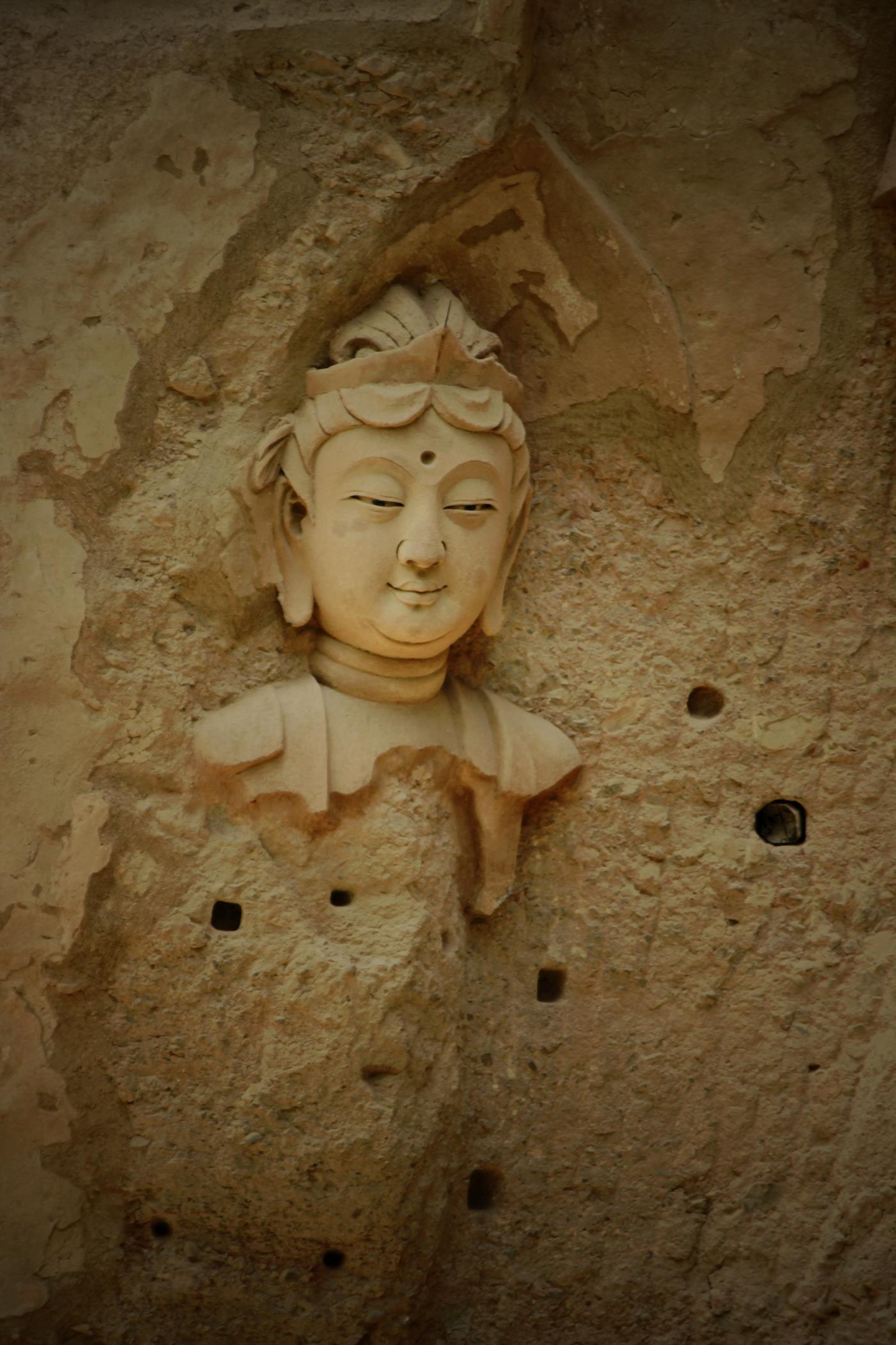 佛座下方的尖拱形浅龛内也塑有一佛二菩萨,系石胎泥塑,是宋代重塑的作品,佛通高4米,菩萨2.5米。右边的大势至菩萨,头戴宝冠,细眉凤眼,面庞丰润,嘴角微微上翘,虽然塑像只剩头部,但我们依然可以看出菩萨的大慈大悲之心。她的微笑是对世人无限关怀的微笑,是洞察一切睿智的微笑,是对现实生活自信的微笑,是发自内心喜悦的微笑,这一富有洞中内涵的微笑,展现了中华民族特有的品格和气质。2001的中国文化报评论她堪比西方的“蒙娜丽莎”,被称作是“东方的维纳斯”。