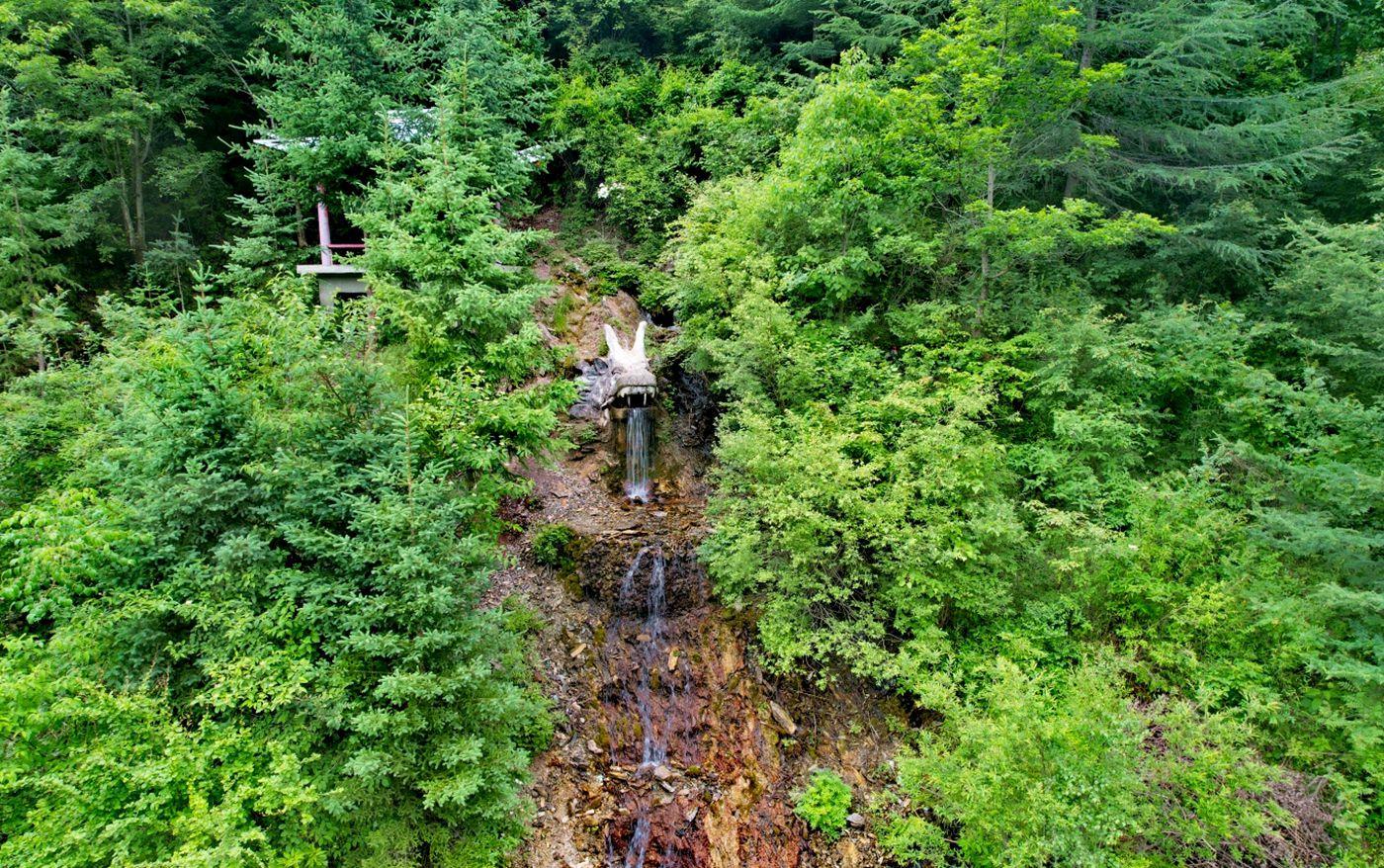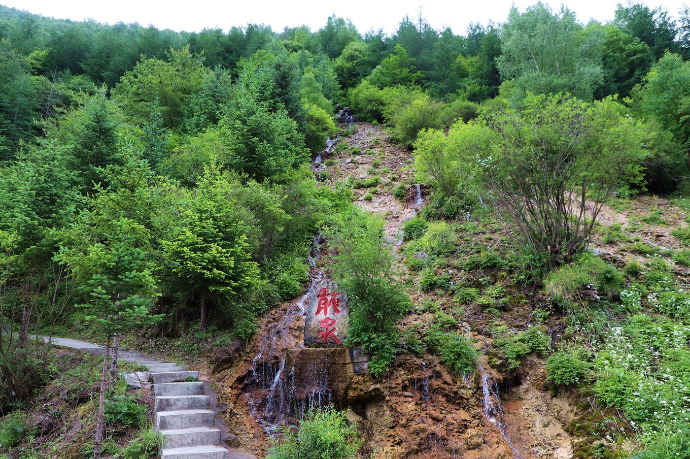 龙泉在南岔沟中间的悬崖上,水量充沛,龙口喷水,顺山势而下形成瀑布群,落差有40余米,山上有亭台楼阁,峰峦溪涧,曲径小道,飞泉瀑布,组成了一幅浓墨重彩的山水画,交相辉映,这就是其中一大胜景“卧牛龙泉”。