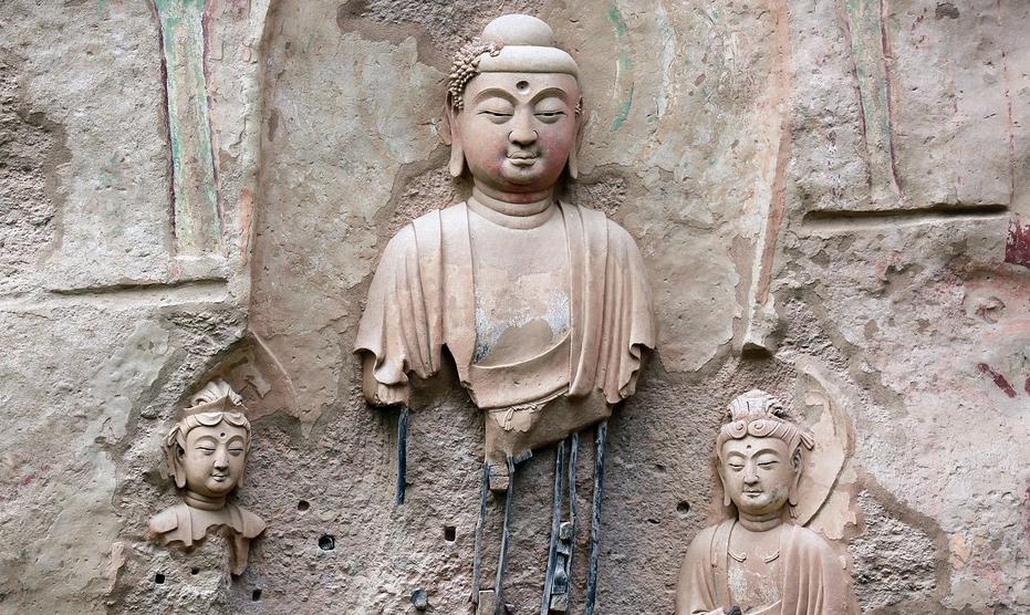 佛座下方的尖拱形浅龛内也塑有一佛二菩萨,系石胎泥塑,是宋代重塑的作品,佛通高4米,菩萨2.5米。右边的大势至菩萨,头戴宝冠,细眉凤眼,面庞丰润,嘴角微微上翘,虽然塑像只剩头部,但我们依然可以看出菩萨的大慈大悲之心。她的微笑是对世人无限关怀的微笑,是洞察一切睿智的微笑,是对现实生活自信的微笑,是发自内心喜悦的微笑,这一富有洞中内涵的微笑,展现了中华民族特有的品格和气质。2001的中国文化报评论她堪比西方的“蒙娜丽莎”,被称作是“东方的维纳斯”。