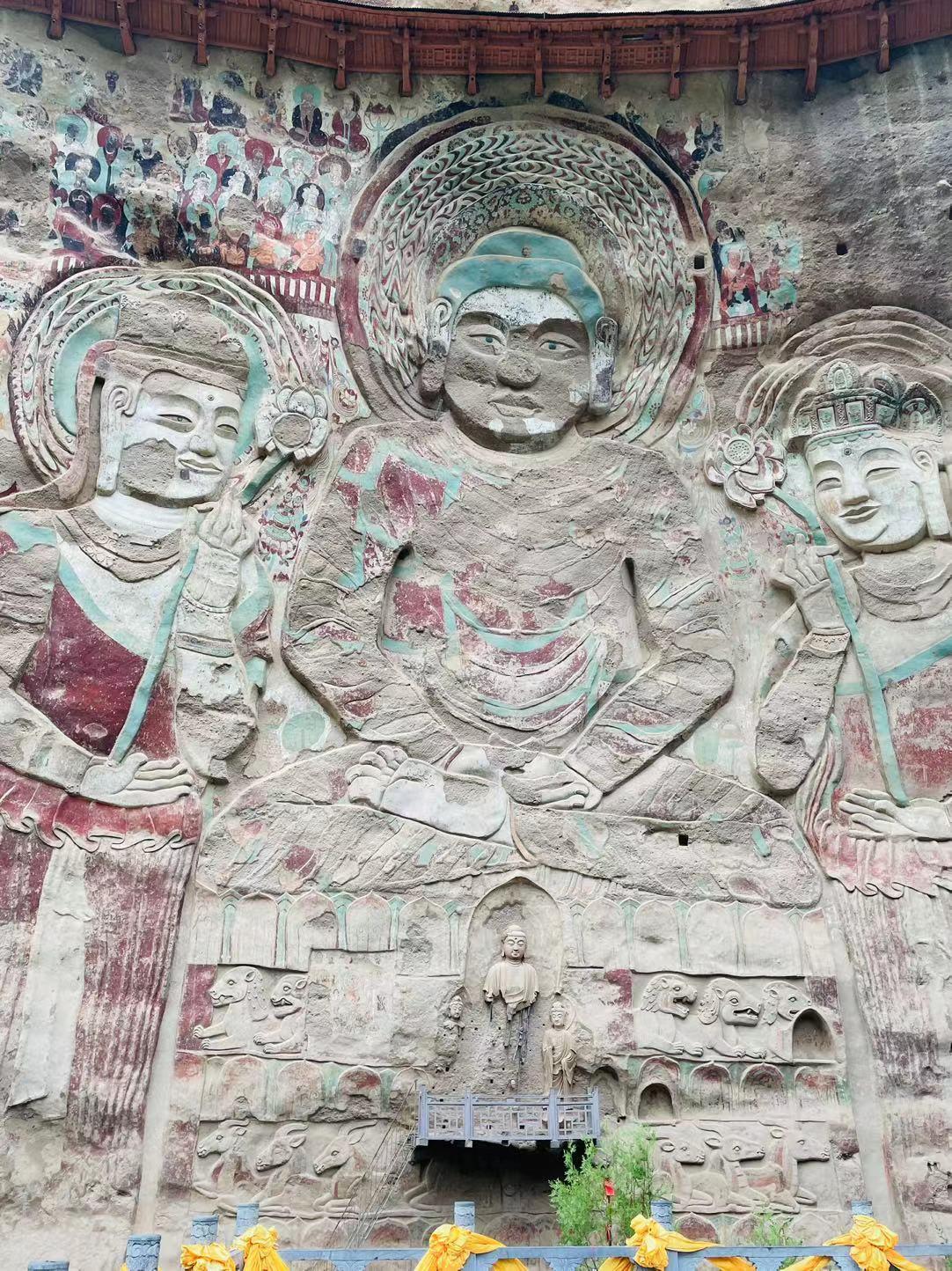 壁画最顶端的坐佛、飞天和崖面左下方的牛拉大篷车为北周原作,其描绘的飞天衣袂飘舞、舞姿优美且更显亲切,牛拉车则反映了当时的太平盛世,它表现的是一牛车长途跋涉稳健前行的形象。图中牛体健美强壮,昂首挺胸,双目前视,四肢用力,显出负重的样子。车轮大而圆,十三根宽形辐条呈放射状轮轴与宽厚的轮边相连,给人以强烈的木质感,在整组佛像壁画庄严的气氛中多了一份世俗生活的生活气息。飞天下方的一佛二菩萨二弟子为宋代重做,佛留有八字小须,是典型的西域绘画手法,用来中和在唐代时候逐渐形成地具有一定女性化的佛像塑造风格,也是对“玄奘求经”这一历史事件的印证。大佛周围是以菩提树、菩萨、弟子、供养人为主要题材的壁画均采用单线勾勒轮廓,线条清晰,色泽鲜艳,有着春蚕吐丝的风格,历经千年,我们看来依旧不禁赞叹当时工匠高超的技艺。