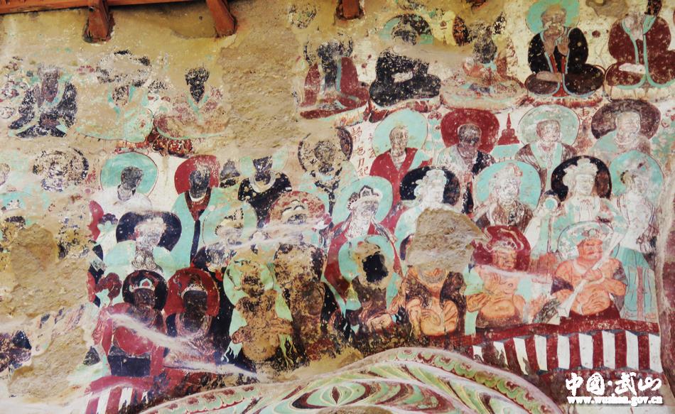 水帘洞单元现存有北周、宋和元代绘制的说法图,此说法图以浮雕和壁画相结合的佛教故事作品为主,现仅存西壁长十七米、高约八米的壁画一方,按内容以二十四组画面映衬布局。您看高大的释迦牟尼佛端立在画面正中,气势显赫,引人注目。大佛两手平行托举于胸前,手心向外,作讲经说法相。两个胁侍菩萨站立两旁,神态安定自然。周围以飞天簇拥,他们大都袒胸露臂,或凌空飞舞,或奏乐高歌,或布散花雨,其身姿之轻盈,动作之优美,神态之高雅,与敦煌莫高窟飞天有同工异曲之妙,堪称艺术佳作。