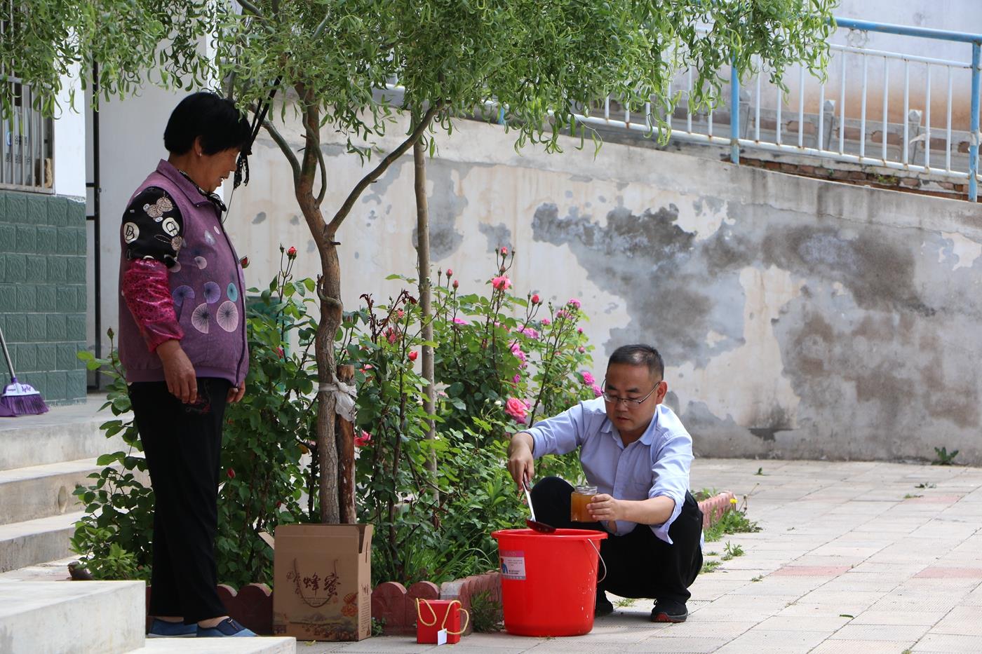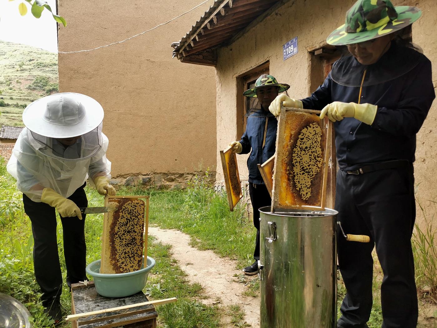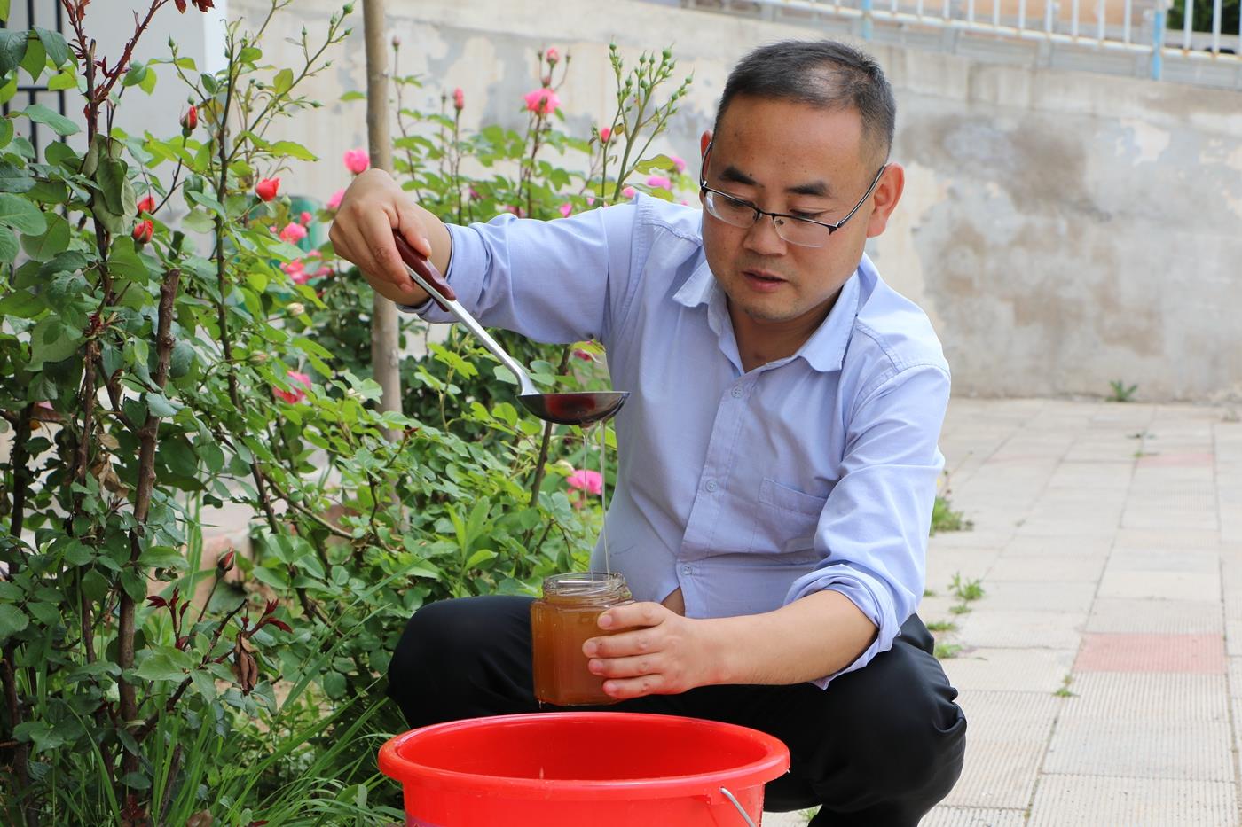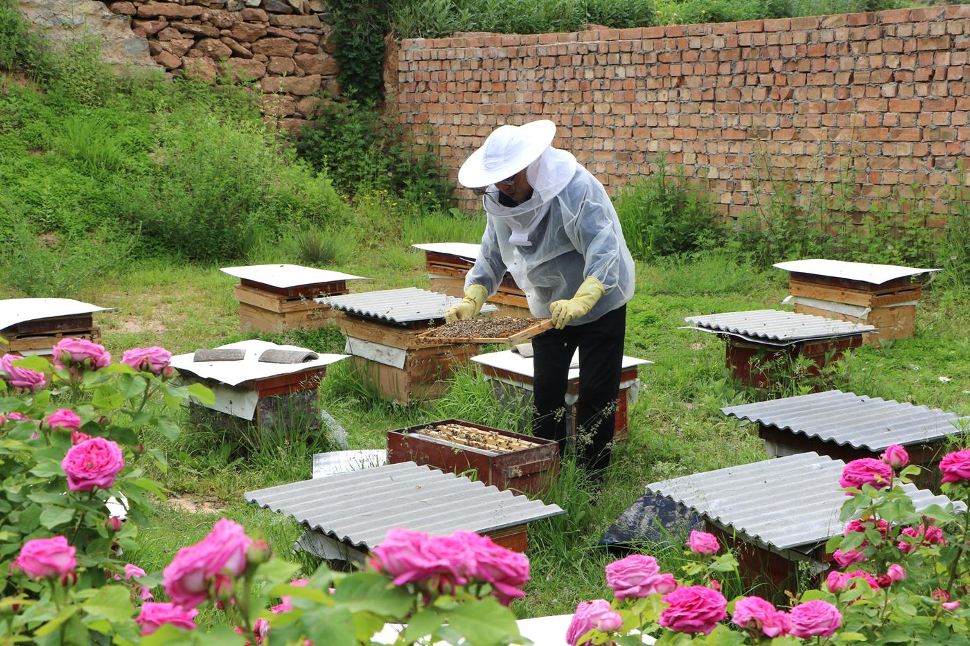 眼下正是洋槐花盛开的季节,牟敏也带着大家忙着采收蜂蜜。走进村中,率先吃螃蟹的蜂农们,把蜂箱摆在了田间地头、房前屋后、闲置院落、草地树林间。村民赵录有家里三代养蜂,在他的蜂场里,从传统的木桶蜂箱到新式的养蜂箱,通过帮扶,他的养殖规模逐步壮大,现在已经扩展到16箱。