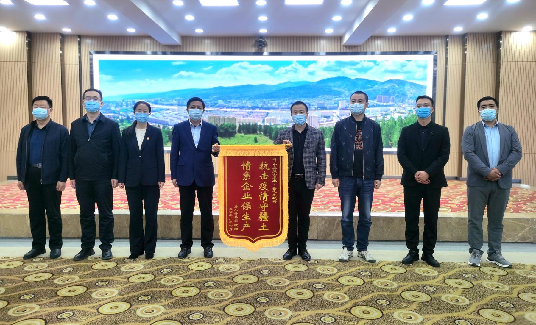 武山县融媒体中心4月29日讯(记者 王继明 颉宏斌 彭雪)4月29日,为感谢武山县长期以来特别是在疫情防控工作中对唐人神集团武山分公司的关心和支持,受唐人神集团总部委托,西北大区总裁吴明明一行向县委、县政府赠送锦旗并表示感谢。县委副书记马福胜,县委常委、副县长石云,县委常委、组织部部长宋昌华,县人大常委会副主任郭海涛出席赠送仪式。