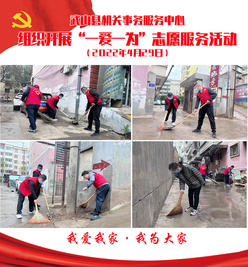 武山县融媒体中心4月29日讯(记者 张燕燕)爱一座城,护一方家。4月29日,武山县各部门各单位各乡镇积极组织志愿服务者到各自包抓区域开展“一爱一为”志愿服务活动,努力营造干净整洁、舒适美丽的生活环境,为建设美丽家园贡献力量。