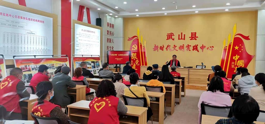 新时代文明实践中心建设工作开展以来,武山县坚持以习近平新时代中国特色社会主义思想为指导,着眼凝聚群众、引导群众、以文化人、成风化俗,紧紧围绕传播新思想、引领新风尚的目标任务,高站位谋划,高标准推进,按照“155366”思路(紧盯“一个目标”,围绕“五个定位”,开展“五项工作”,做到“三个到位”,提升“六大能力”,抓好“六个重点工作”。)结合城乡共治“六大行动”,以“我爱我家·我为大家”为主题的“一爱一为”志愿服务行动为统领,积统筹推进宣传宣讲、教育引导、文化体育、科技科普、卫生健康、法治宣传、新风培育及“三包三好”、城乡环境清洁、人居环境提升、乡村公路整治等11项志愿服务活动,大力实施理论铸魂、文化引领、立德树人、基层治理、志愿服务、项目强化“六大工程”,建成以党组织书记任主任、所长、站长兼志愿服务队长的县、乡、村(学校)三级新时代文明实践中心和所、站465个,打造新时代文明实践示范基地14个,实现了县、乡(镇)、村(社区)新时代文明实践中心、所、站全覆盖,积极探索打造了新时代文明实践中心建设的“武山模式”。