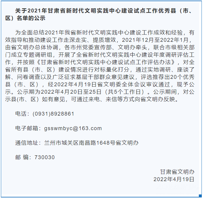 武山县被评为2021年甘肃省新时代文明实践中心建设试点工作优秀县(市、区),正在公示。