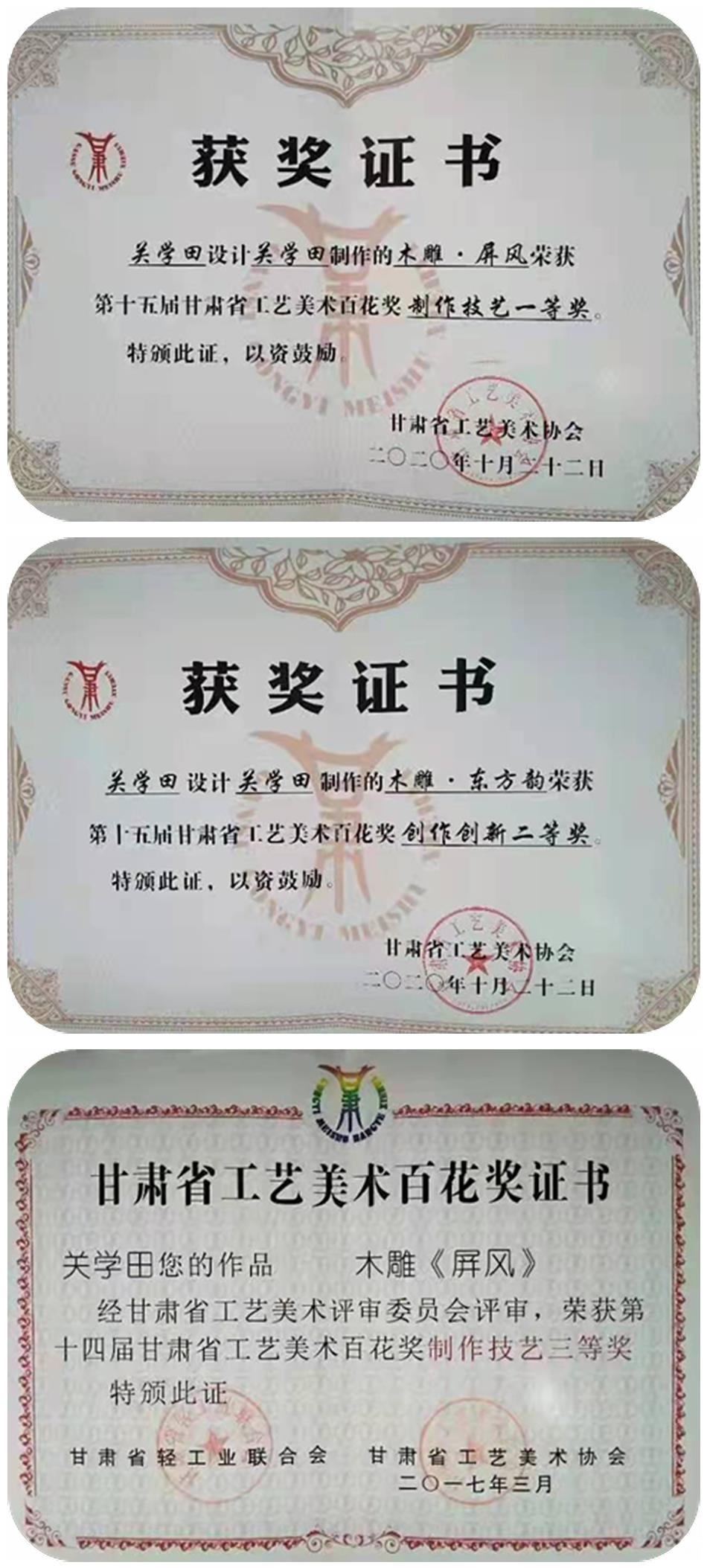 关学田是非物质文化遗产“武山木雕”的县级传承人,也是中国民间文艺家协会会员、甘肃省工艺美术协会会员、甘肃省民间文艺家协会会员、武山县民间文艺家协会理事,近年来荣获甘肃省第十四届工艺美术百花奖制作技艺三等奖,甘肃省第十五届工艺美术百花奖制作技艺一等奖、创作创新二等奖。