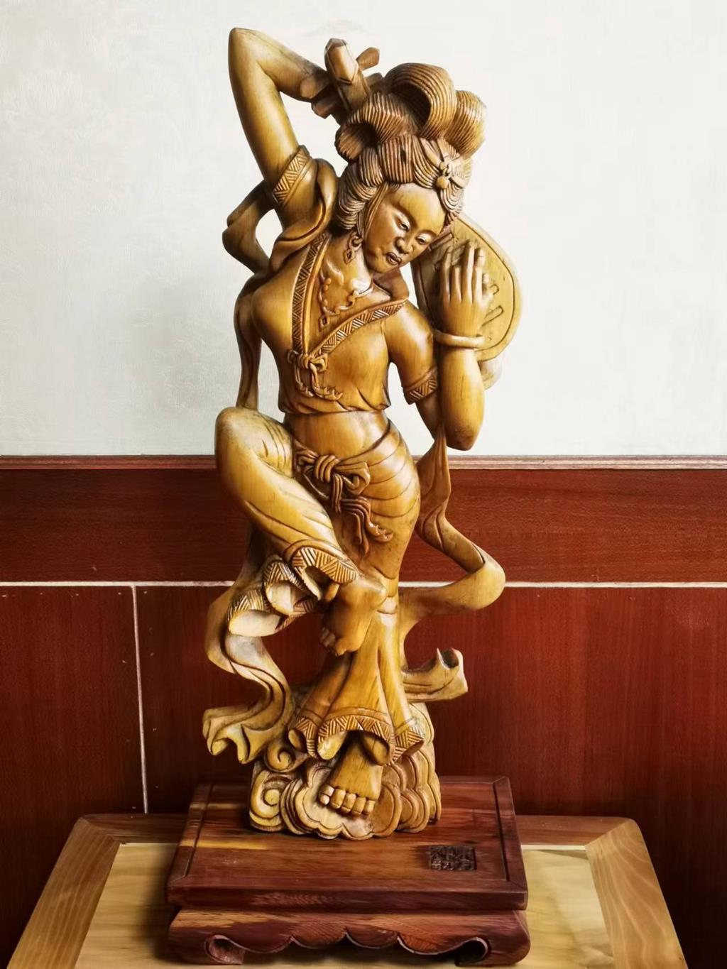 这件“东方韵”作品获得甘肃省第十五届工艺美术百花奖创业创新二等奖。关学田说,“东方韵”这件木雕人物作品,为充分展现人物的立体形态,考虑到制作工艺的特殊性,在选材上优先选用当地出产的红桦木。受敦煌飞天的人物形态启发,他又借鉴了伎乐俑的部分元素,作品在整体形态上体现东方女性特有的温柔、灵动、知书达理的自然之美。在制作工艺技法上主要用了圆雕技法,无论从局部还是到整体,都能给观众一种赏心悦目的美感。