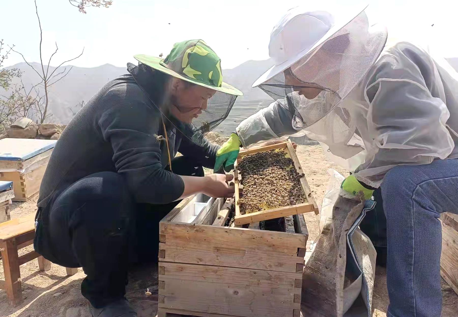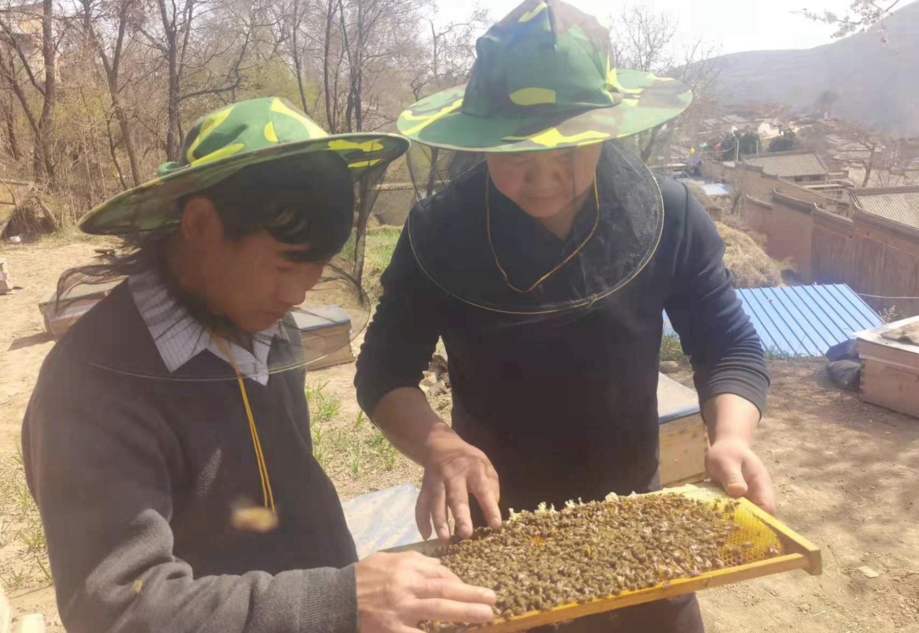 “初到村里,我挨家挨户了解情况,掌握村里每一户村民的家庭状况,寻求增收渠道。”作为武山县地震局派驻的帮扶队员,史亚祥的主要工作是帮助明山村巩固扶贫成效,稳步提升脱贫成果,助推乡村振兴,让产业健康可持续发展。一个偶然的机会,他从电脑上看到了一个养蜂的视频,从此,养殖中蜂的想法就一直占据着他的脑海。利用闲暇时间,他通过各种渠道观看中蜂养殖视频,查蜂、认王、加脾、抖蜂、摇蜜、并群、换王等养蜂技术都学了一遍。“明山村海拔高,气候好,农田大量种植油菜和中药材,这样独特的地理气候优势非常适合发展养蜂产业。村里原先一直有养土蜂的传统,但都是小打小闹,产的蜂蜜都是自己食用,没有形成产业效益。”史亚祥说,第一年看到大家都是观望的态度,就自己先试验,给群众尝试“定心丸”。