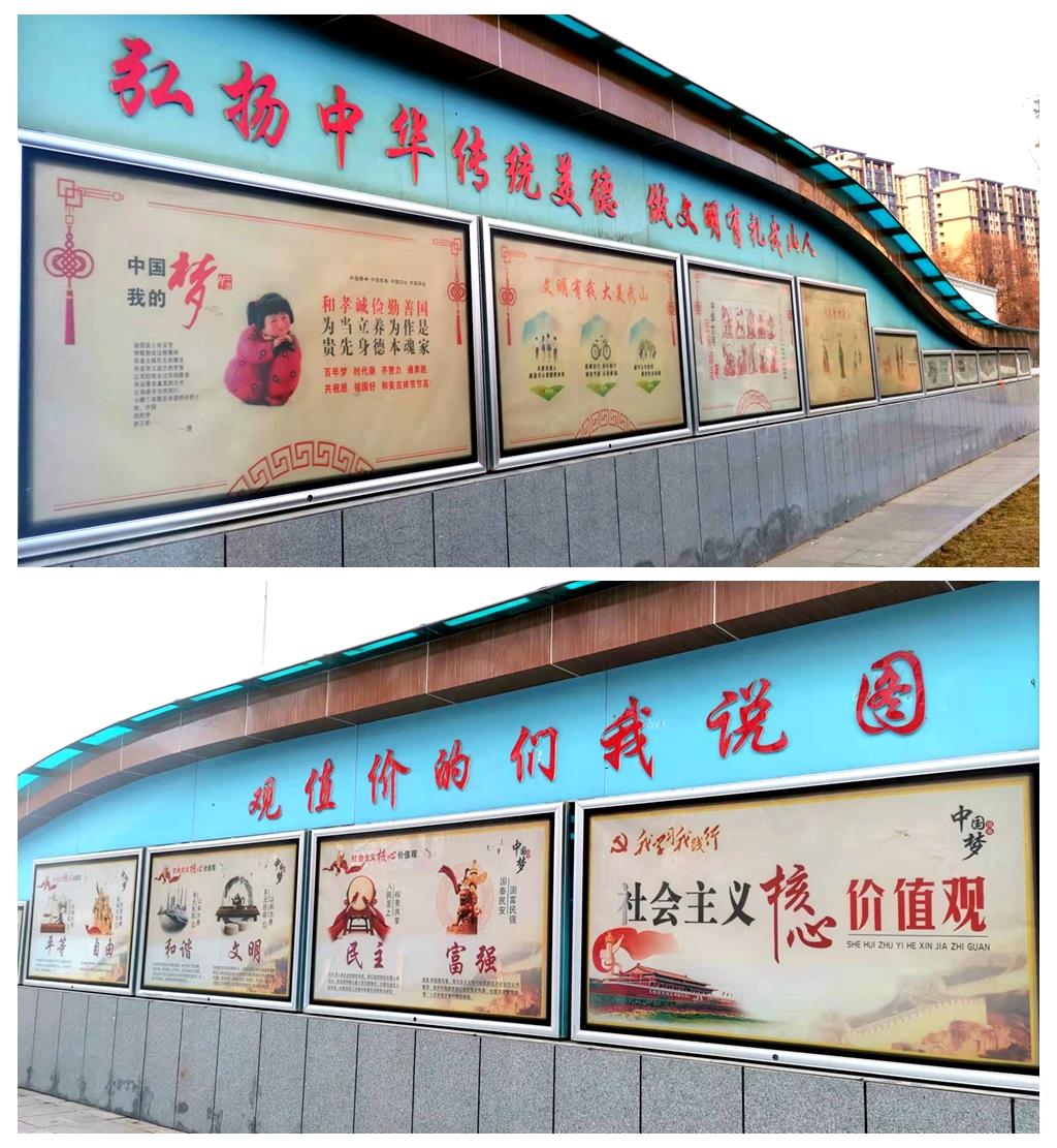 弘扬中国传统美德宣传教育长廊用生动的形象、通俗的语言,引导广大市民从我做起、从身边小事做起,遵守社会公德、恪守职业道德、弘扬家庭美德、提升个人品德,大力弘扬崇德尚礼、见贤思齐的社会风尚,孝悌忠信、礼义廉耻的荣辱观念,养成勤俭节约,使用公筷公勺的生活习惯,让绿色环保成为人们的自觉行动,实现节俭、健康、环保的生活方式。在传播文明理念、引领时代新风,倡导文明健康、绿色环保的生活方式方面发挥着积极作用。