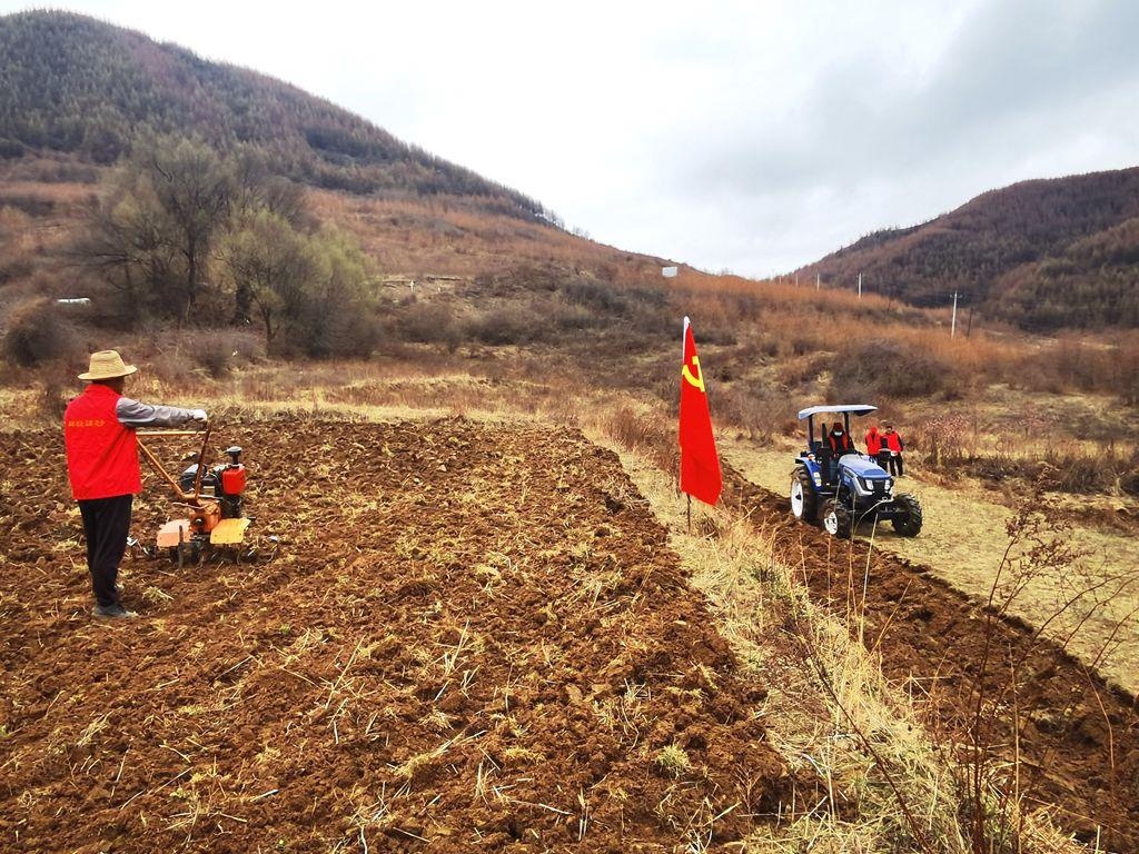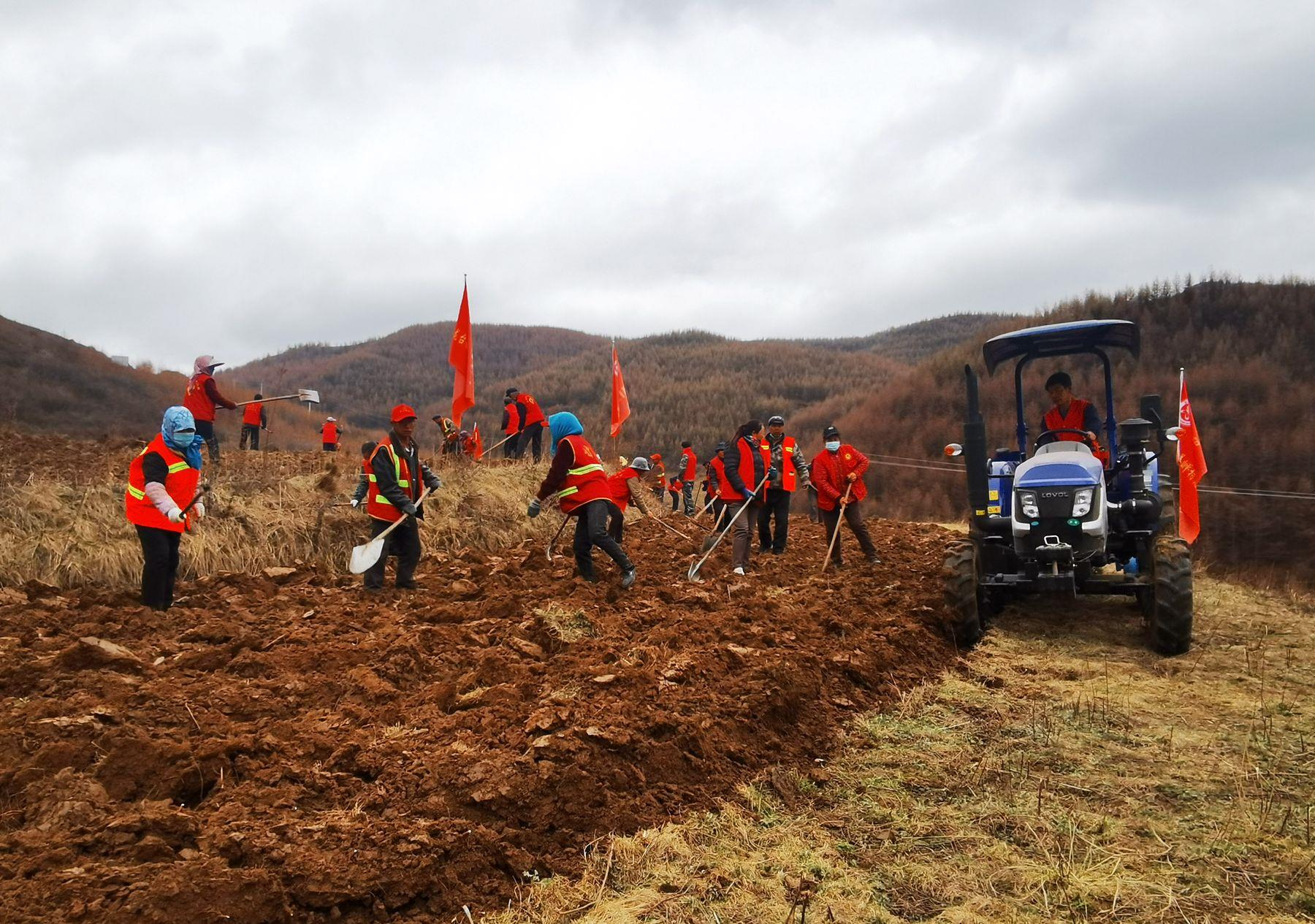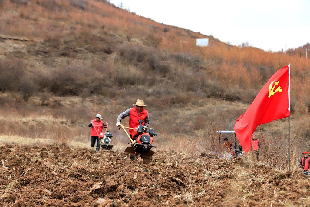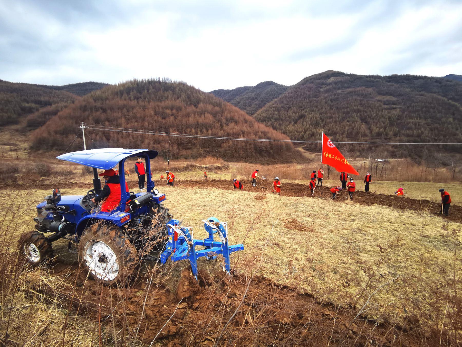 3月的龙台镇青山村,春寒料峭。21日下午,记者在青山村的一块撂荒地看到,青山村党支部书记史存保正开着耕地机在荒地里作业。“隆隆”的耕地机轰鸣声在山间回荡,不绝于耳,随着耕地机齿轮翻滚,一排排泥土都被翻垦出来。然后,身穿红马甲的志愿者和农户们手拿锄头、铁锹等工具把土块拍散。“村上利用中央‘三部委’扶持壮大村集体经济项目资金花了8万块钱买了这台大型耕地机。大型机器耕地作业速度快、效率高,今年开春到现在已经开荒60余亩了。”史存保说。