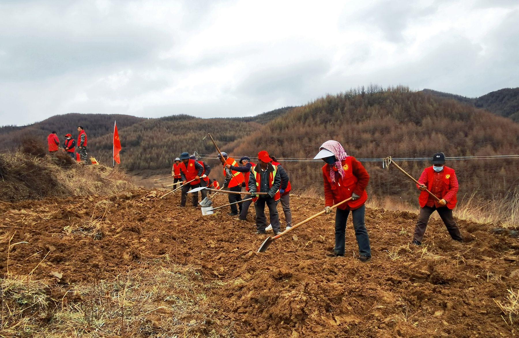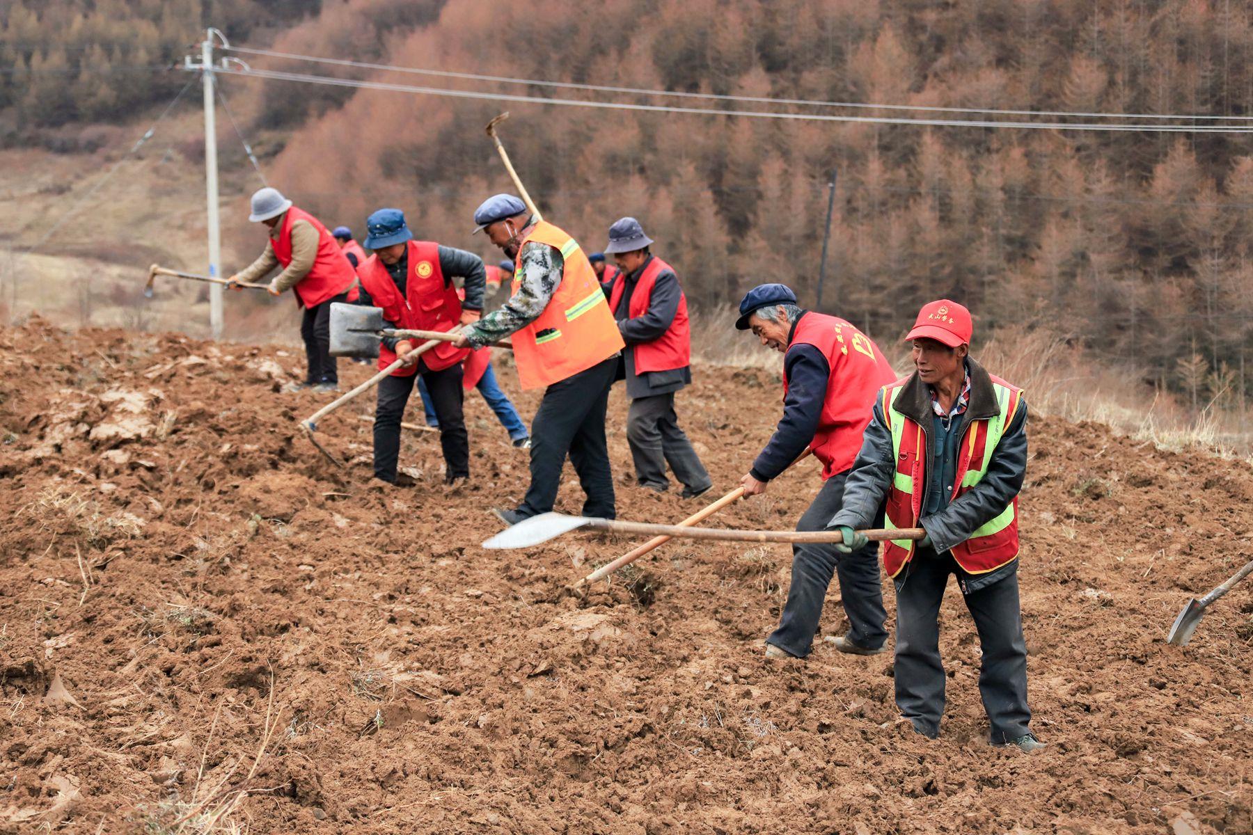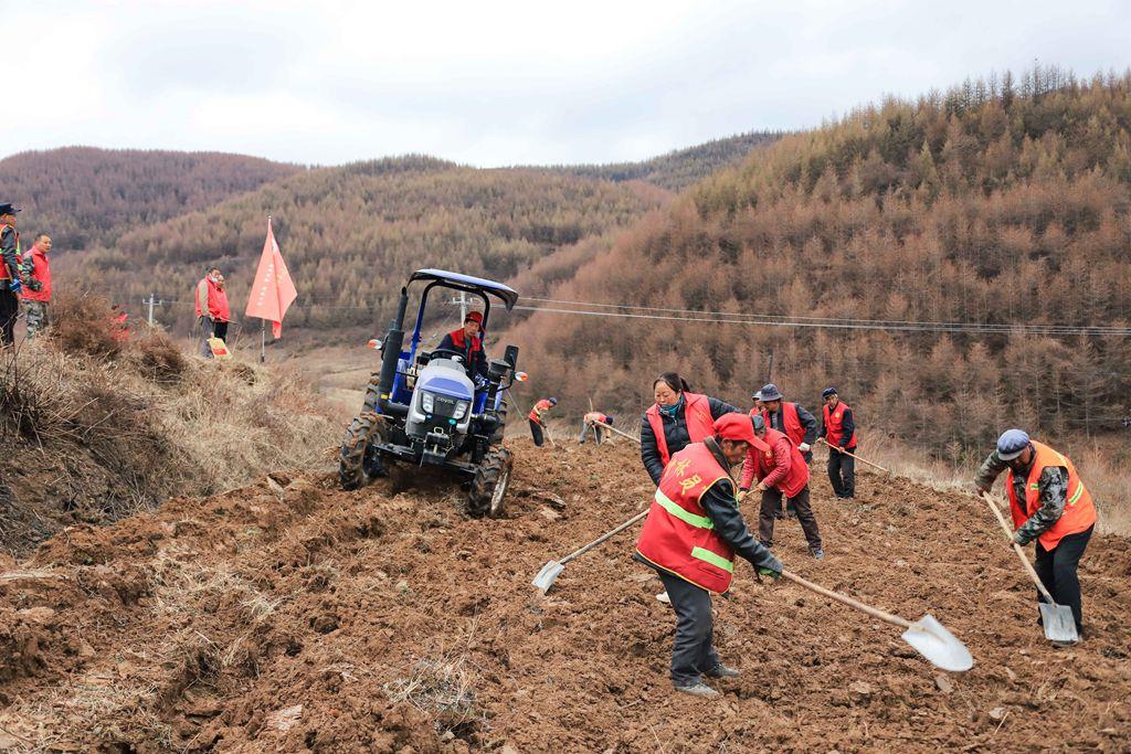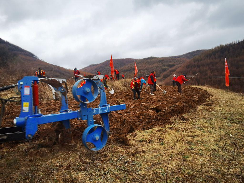 3月的龙台镇青山村,春寒料峭。21日下午,记者在青山村的一块撂荒地看到,青山村党支部书记史存保正开着耕地机在荒地里作业。“隆隆”的耕地机轰鸣声在山间回荡,不绝于耳,随着耕地机齿轮翻滚,一排排泥土都被翻垦出来。然后,身穿红马甲的志愿者和农户们手拿锄头、铁锹等工具把土块拍散。“村上利用中央‘三部委’扶持壮大村集体经济项目资金花了8万块钱买了这台大型耕地机。大型机器耕地作业速度快、效率高,今年开春到现在已经开荒60余亩了。”史存保说。