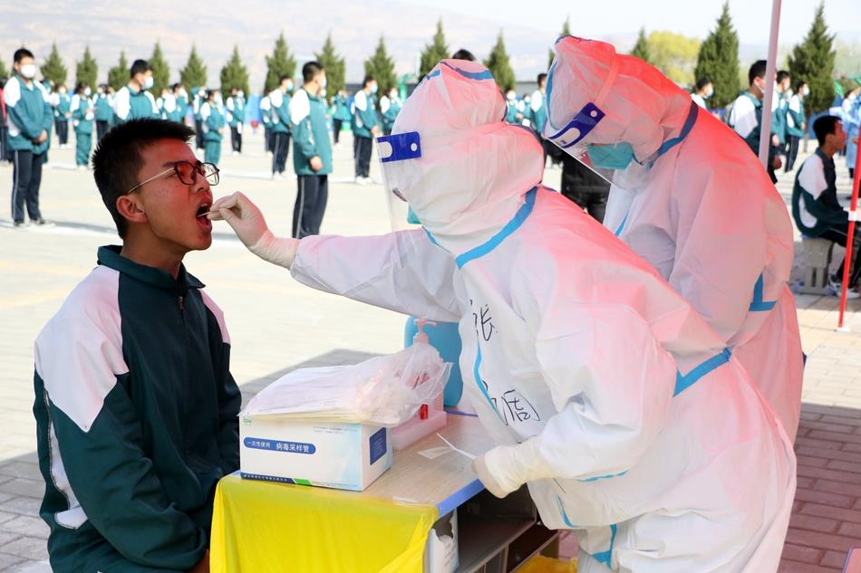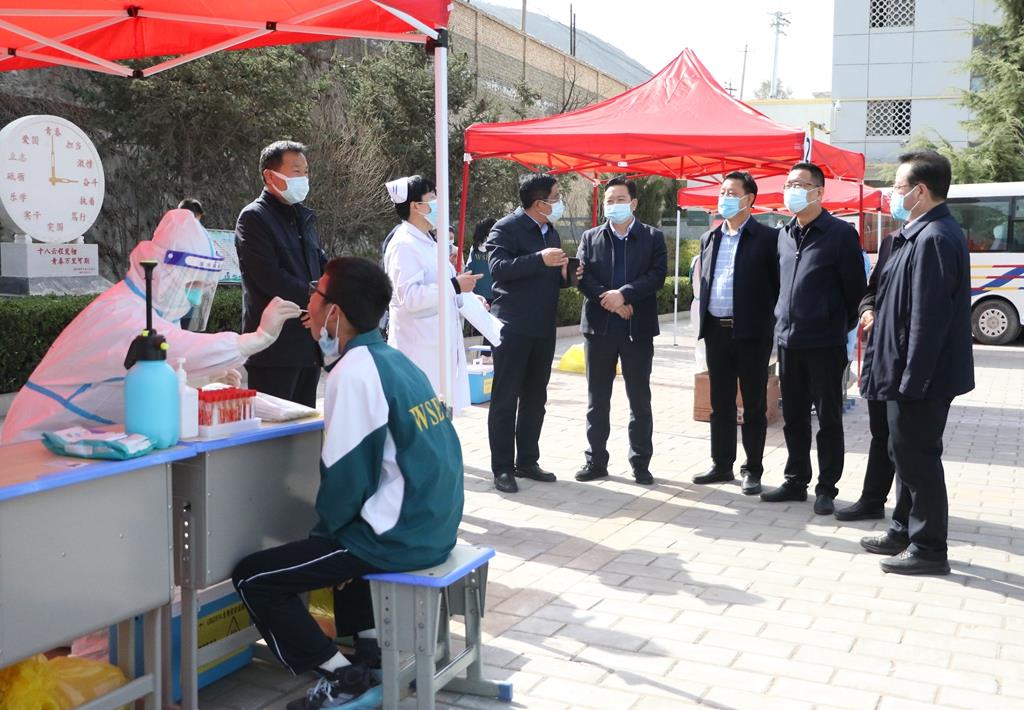 3月23日,县委副书记、县长王志成,县政协主席庞明全深入武山县第二高级中学、洛门镇初级中学等地,检查指导校园核酸检测工作。副县长李峰一同检查。