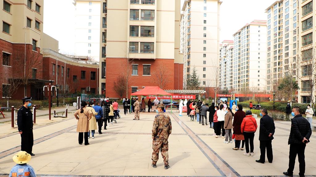演练现场,各采样点位设置明显标识,居民在工作人员的引导下,佩戴口罩,经过体温检测、健康码查验,按照“一米线”的提示有序排队,经登记、取样后快速离开现场。