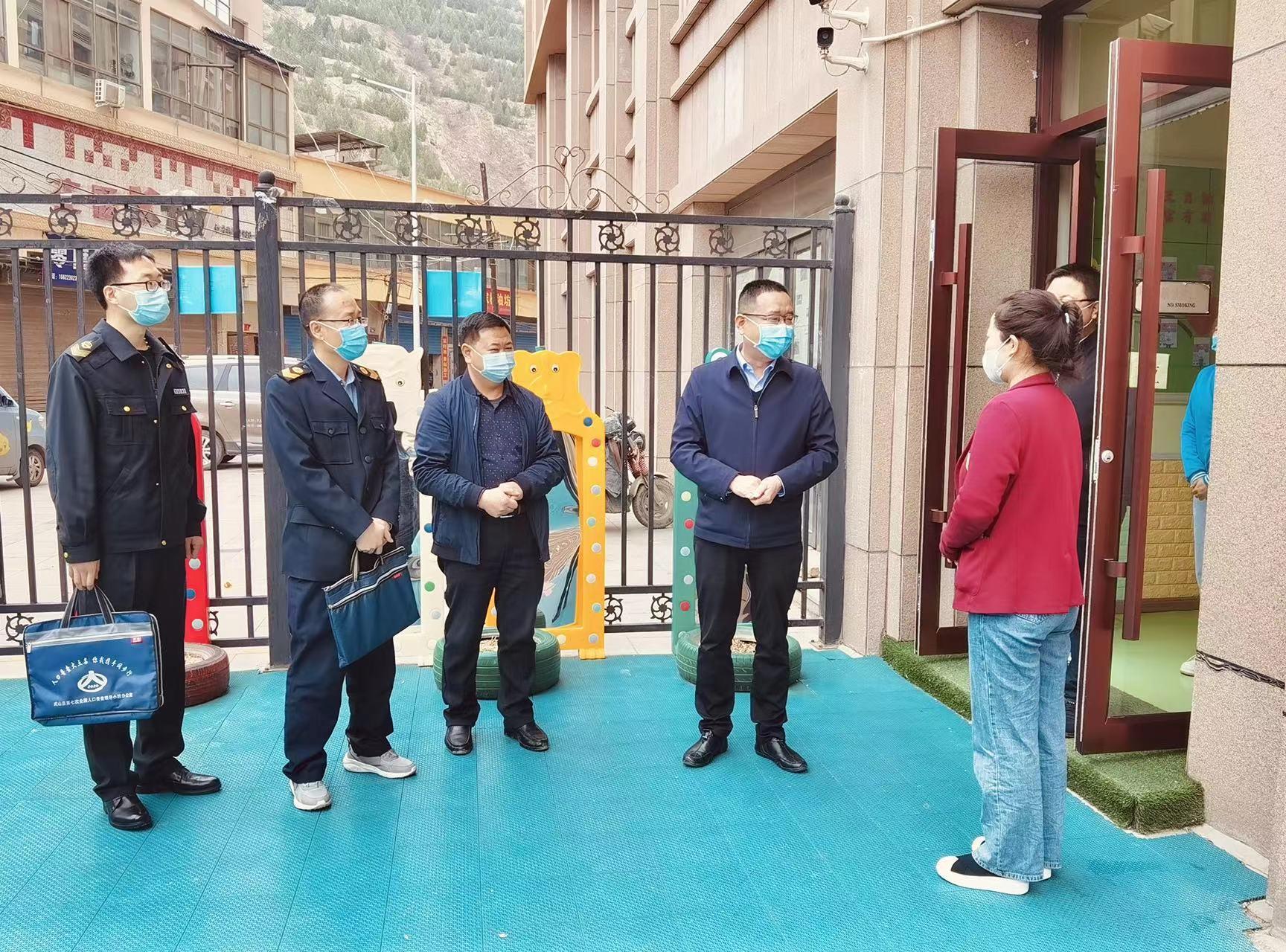 武山县融媒体中心3月17日讯 (记者 邓晨阳)3月17日,副县长李峰带领县教育、卫健、市场监管等部门负责人,深入到城区添彩幼儿园、向阳幼儿园、博雅幼儿园和鸳鸯镇阳光幼儿园、高楼镇小芳幼儿园等地,督查指导民办幼儿园校园门口出入登记、体温检查等疫情防控措施落实情况。