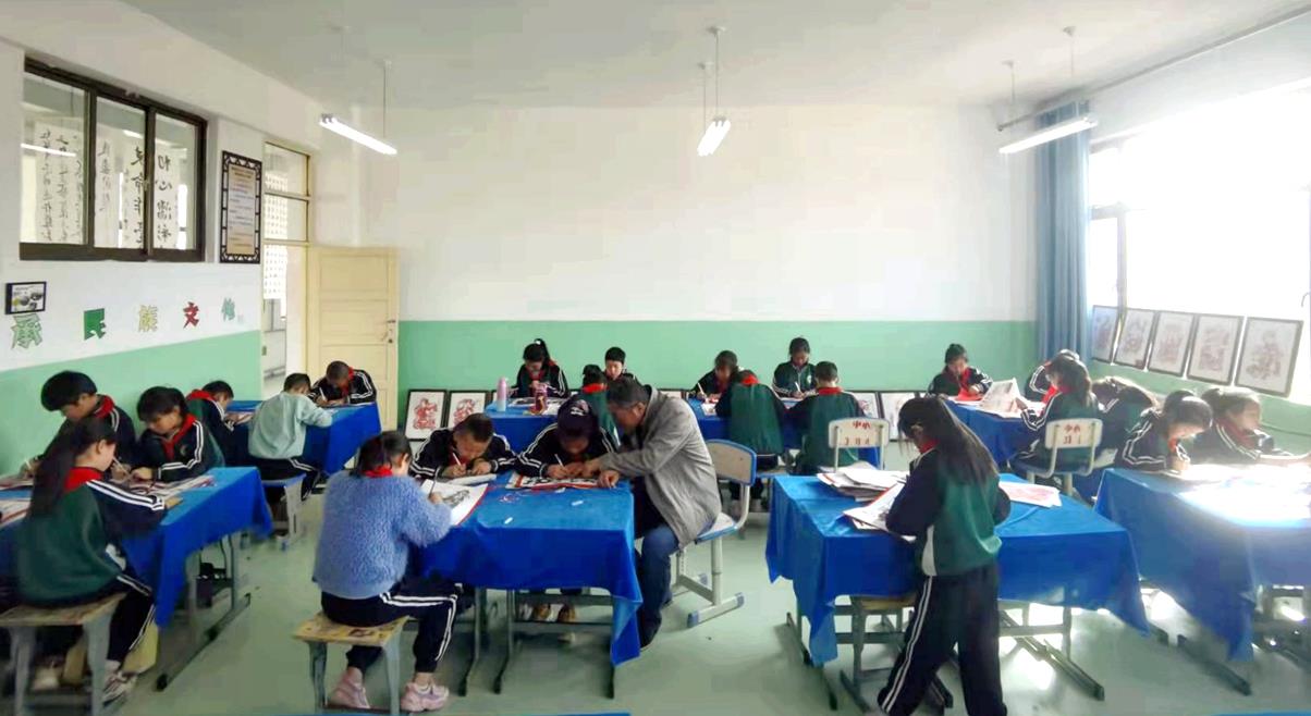 武山县融媒体中心3月17日讯(记者 薛小瑞 马国栋 杨同乐 张燕燕)“剪的时候一定要保持姿势端正、刻刀垂直,注意先内后外、似断非断,刀法做到稳、准、巧。”鸳鸯镇中心小学剪纸兴趣班的同学们正在跟着非遗项目武山剪纸技艺县级代表性传承人刘吉平老师讲解的步骤,根据纸上画好的图案,拿起刻刀小心翼翼剪刻,一张张红纸随即变成了各种形态的剪纸作品,惟妙惟肖。