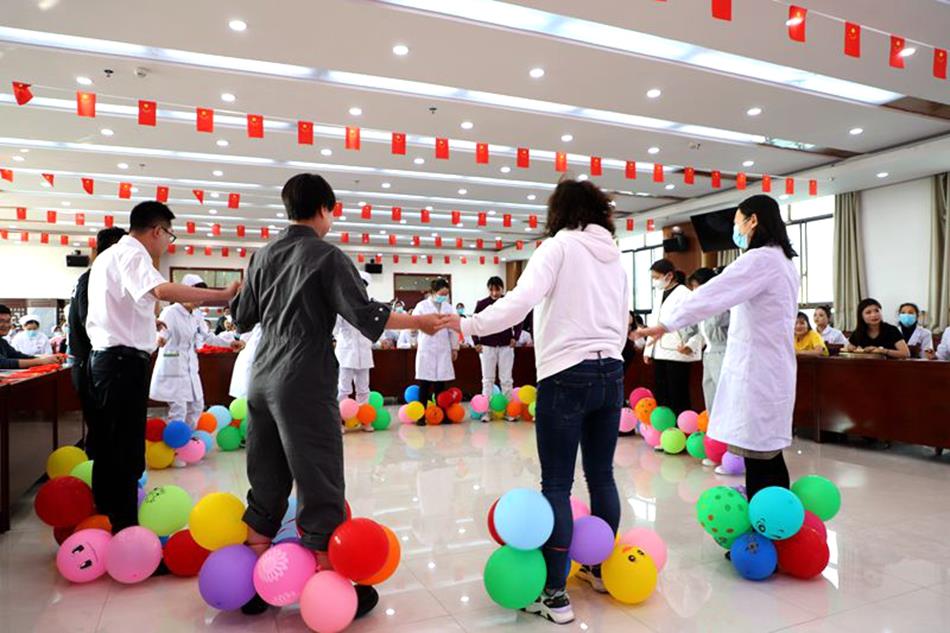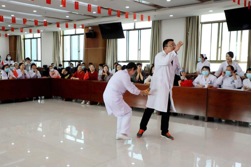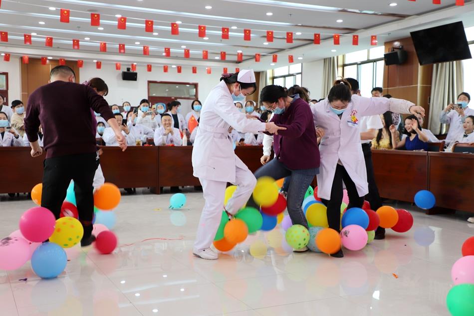 趣味运动会分为内儿、 手术骨伤、外科妇产、康复急诊、医技、行政后勤、门诊共7个组进行,参与者不仅有各科室女士医护人员,还有男士代表。趣味内容为你来比划我来猜、踩气球、公鸡下蛋等。活动现场,各科室派出代表配合默契,他们诙谐的举止、搞笑的动作将现场气氛推向高潮。随后举行了丰富的文艺演出,全面展示了白衣天使的多才多艺。