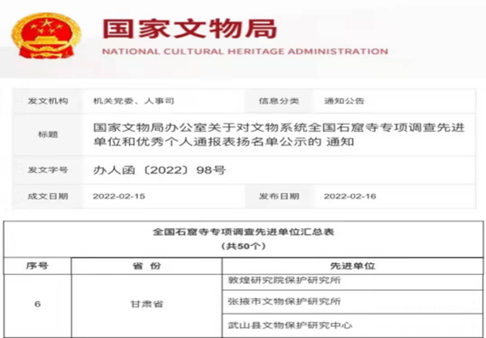 近日,国家文物局办公室对文物系统全国石窟寺专项调查先进单位和优秀个人进行通报表扬,武山县文物保护研究中心获全国石窟寺专项调查先进单位荣誉称号,为全省受表彰的3个先进单位之一。
