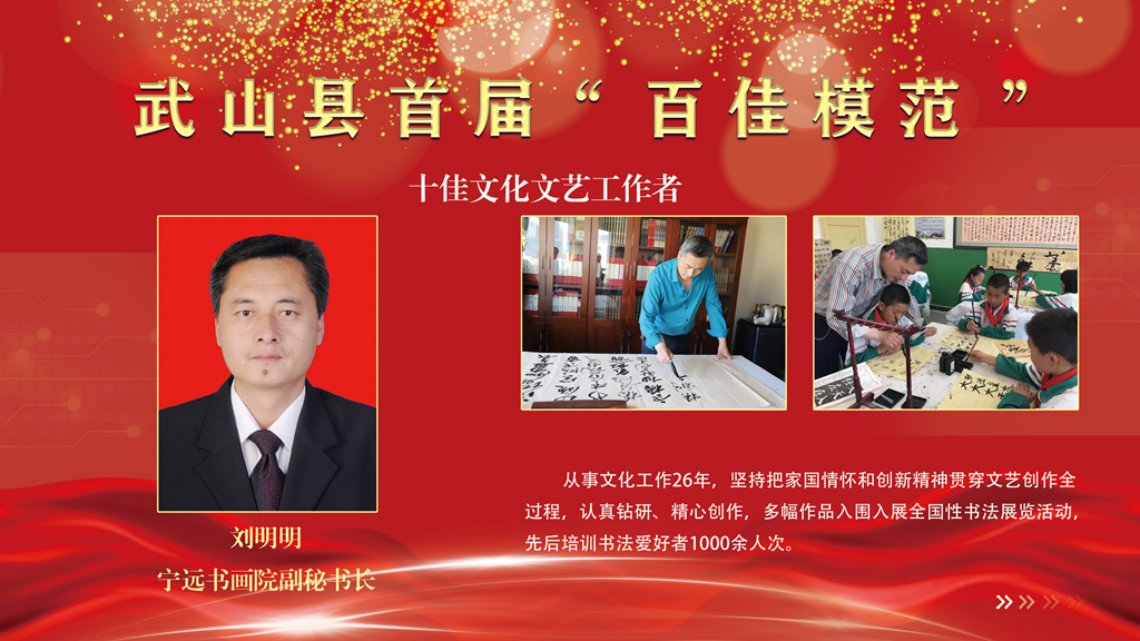 刘明明,宁远书画院副秘书长。从事文化工作26年,坚持把家国情怀和创新精神贯穿文艺创作全过程,认真钻研、精心创作,多幅作品入围入展全国性书法展览活动,先后培训书法爱好者1000余人次。