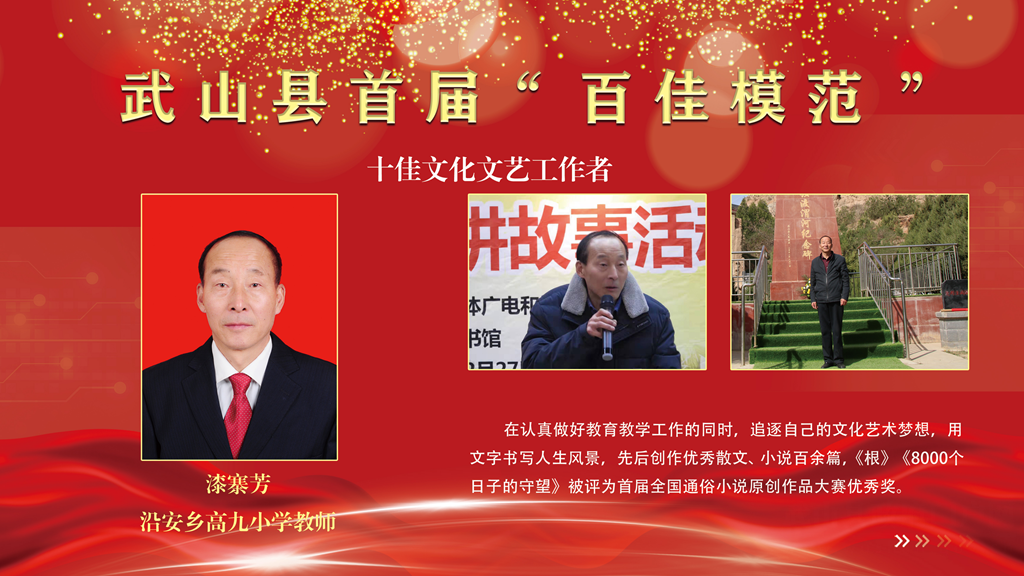 编者按:2021年,武山县坚持以习近平新时代中国特色社会主义思想为指导,紧扣“三新一高”的要求,大力培育和践行社会主义核心价值观,涌现出了一大批作出新贡献、取得新业绩、展现新风貌的先进典型。为树立典型、弘扬正气、凝聚力量,引导和激励广大干部群众向先进模范学习,争做崇高道德的践行者、文明风尚的维护者、美好生活的创造者,县委宣传部、县融媒体中心联合推出【百佳模范】专题栏目,全面展示“百佳模范”先进事迹和感人故事,为加快建设经济繁荣、城乡美丽、生态宜居、治理高效、人民幸福的现代化新武山凝聚强大的精神动力。