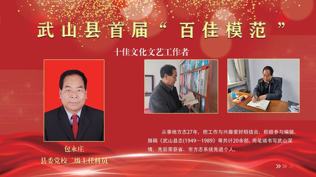 包永庄,县委党校二级主任科员。从事地方志27年,把工作与兴趣爱好相结合,积极参与编辑、撰稿《武山县志(1949—1989)》等共计20余部,用笔端书写武山深情,先后荣获省、市方志系统先进个人。