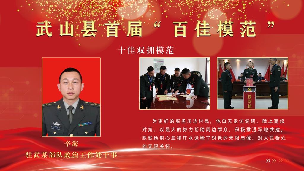 辛海,驻武某部队政治工作处干事。为更好的服务周边村民,他白天走访调研、晚上商议对策,以最大的努力帮助周边群众,积极推进军地共建,默默地用心血和汗水诠释了对党的无限忠诚、对人民群众的无限关怀。