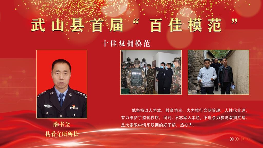 薛书全,县看守所所长、一级警长。他坚持以人为本、教育为主,大力推行文明管理、人性化管理,有力维护了监管秩序。同时,不忘军人本色,不遗余力参与双拥共建,是大家眼中情系双拥的好干部、热心人。