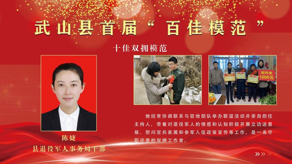 陈婕,县退役军人事务局干部。她经常协调联系与驻地部队举办联谊活动并亲自担任主持人,带着对退役军人的情感和认知积极开展立功送喜报、慰问官兵家属和参军入伍政策宣传等工作,是一名尽职尽责的双拥工作者。