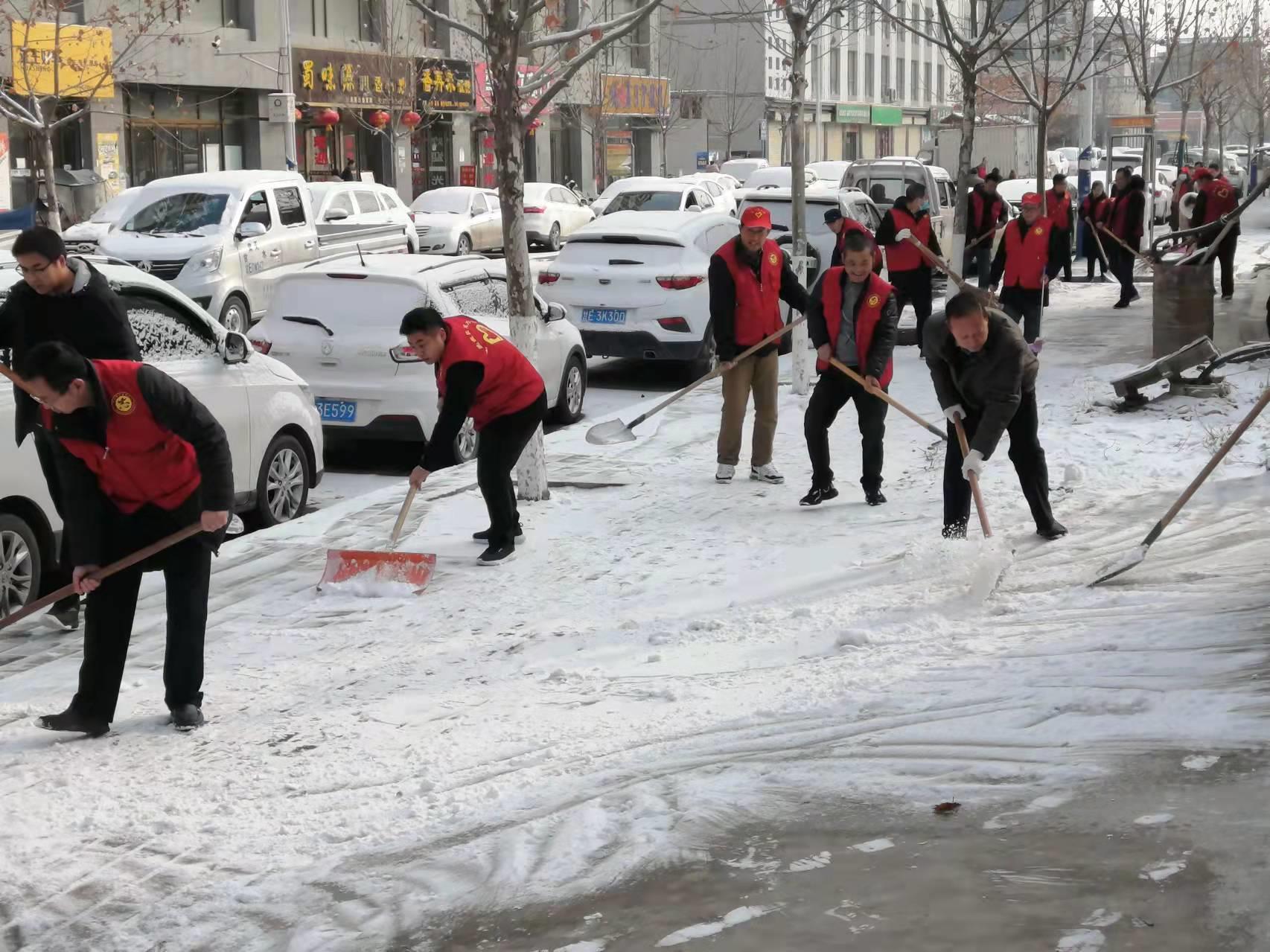 在县城各条主干道、人行桥、南北滨河路人行道上、健身步道、环境卫生包抓区域,各部门单位干部职工的志愿红与环卫公司的橘子黄在白雪的映衬下煞是好看。清雪的、装车的、撒盐的、铲冰的······他们相互配合、干劲十足,绘就了一幅幅同心除雪的壮美画卷。