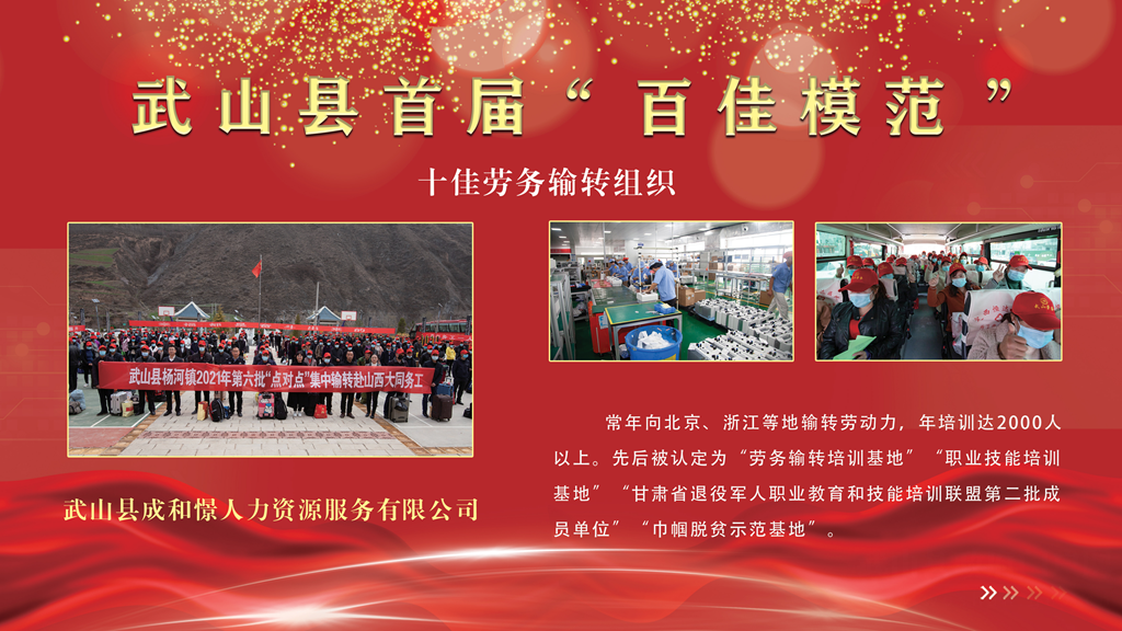 武山县成和憬人力资源服务有限公司。常年向北京、浙江等地输转劳动力,年培训达2000人以上。先后被认定为“劳务输转培训基地”“职业技能培训基地”“甘肃省退役军人职业教育和技能培训联盟第二批成员单位”“巾帼脱贫示范基地”。