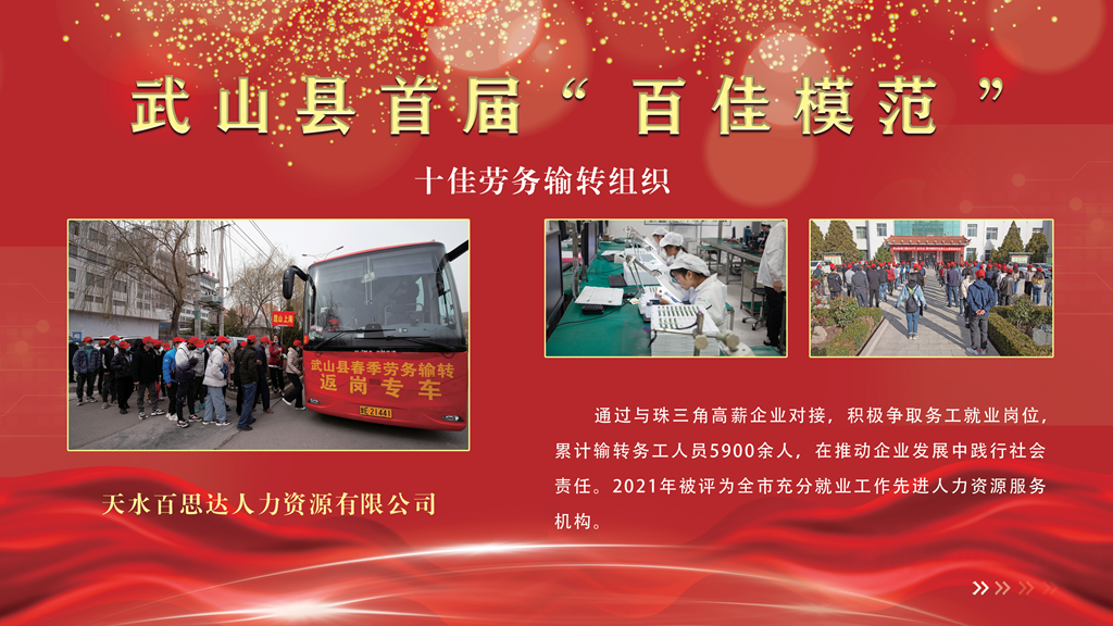 天水百思达人力资源有限公司。通过与珠三角高薪企业对接,积极争取务工就业岗位,累计输转务工人员5900余人,在推动企业发展中践行社会责任。2021年被评为全市充分就业工作先进人力资源服务机构。