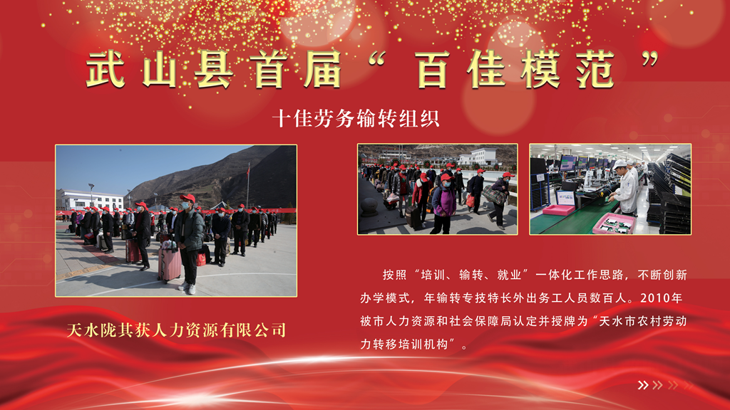 天水陇其获人力资源有限公司。按照“培训、输转、就业”一体化工作思路,不断创新办学模式,年输转专技特长外出务工人员数百人。2010年被市人力资源和社会保障局认定并授牌为“天水市农村劳动力转移培训机构”。