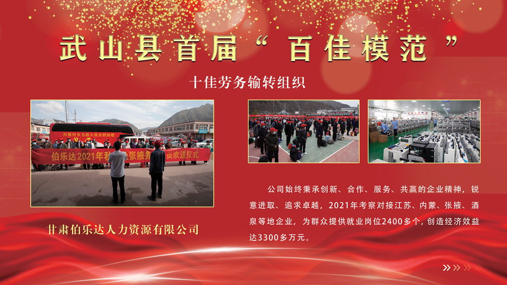 甘肃伯乐达人力资源有限公司。公司始终秉承创新、合作、服务、共赢的企业精神,锐意进取、追求卓越,2021年考察对接江苏、内蒙、张掖、酒泉等地企业,为群众提供就业岗位2400多个,创造经济效益达3300多万元。