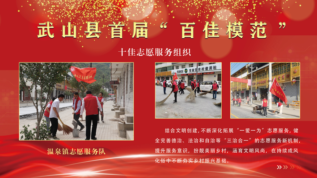 温泉镇志愿服务队。结合文明创建,不断深化拓展“一爱一为”志愿服务,健全完善德治、法治和自治等“三治合一”的志愿服务新机制,提升服务意识,扮靓美丽乡村,涵育文明风尚,在持续成风化俗中不断夯实乡村振兴基础。