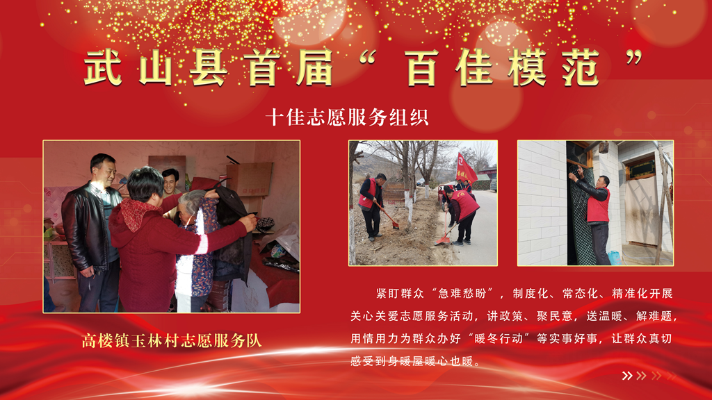 高楼镇玉林村志愿服务队。紧盯群众“急难愁盼”,制度化、常态化、精准化开展关心关爱志愿服务活动,讲政策、聚民意,送温暖、解难题,用情用力为群众办好“暖冬行动”等实事好事,让群众真切感受到身暖屋暖心也暖。