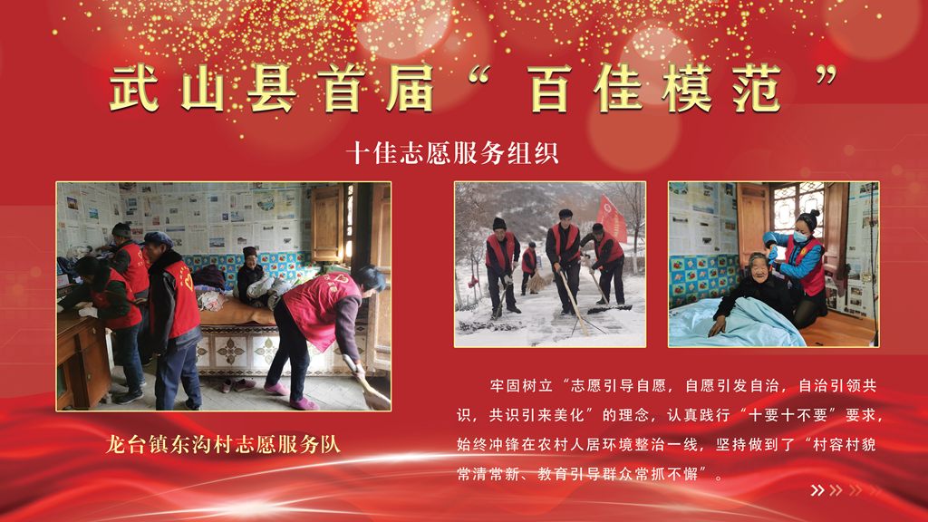 龙台镇东沟村志愿服务队。牢固树立“志愿引导自愿,自愿引发自治,自治引领共识,共识引来美化”的理念,认真践行“十要十不要”要求,始终冲锋在农村人居环境整治一线,坚持做到了“村容村貌常清常新、教育引导群众常抓不懈”。