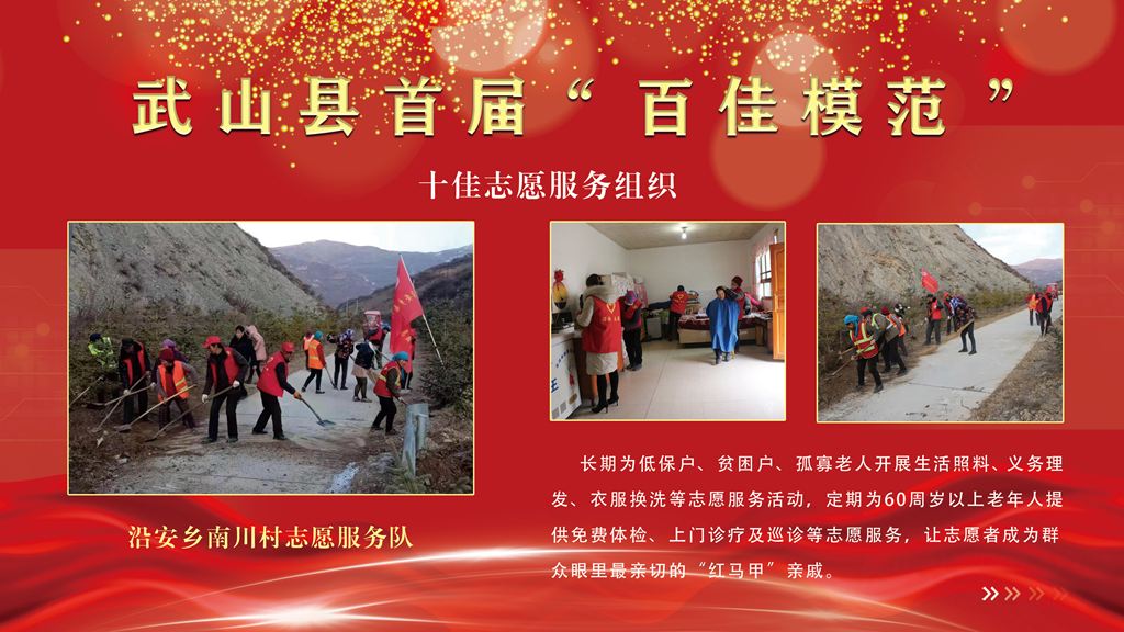沿安乡南川村志愿服务队。长期为低保户、贫困户、孤寡老人开展生活照料、义务理发、衣服换洗等志愿服务活动,定期为60周岁以上老年人提供免费体检、上门诊疗及巡诊等志愿服务,让志愿者成为群众眼里最亲切的“红马甲”亲戚。