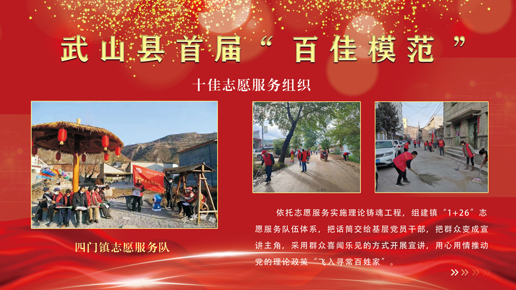 四门镇志愿服务队。依托志愿服务实施理论铸魂工程,组建镇“1+26”志愿服务队伍体系,把话筒交给基层党员干部,把群众变成宣讲主角,采用群众喜闻乐见的方式开展宣讲,用心用情推动党的理论政策“飞入寻常百姓家”。