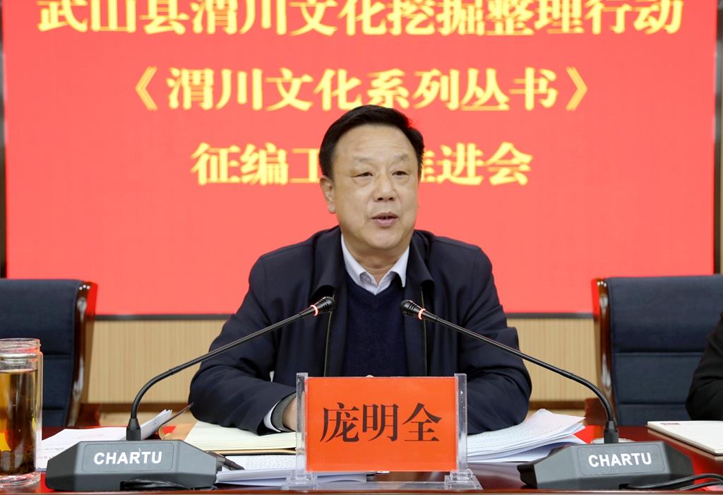 武山县融媒体中心1月25日讯(记者 杨彦春 杨耀斌) 1月24日,武山县召开渭川文化挖掘整理行动《渭川文化系列丛书》征编工作推进会议。渭川文化挖掘整理行动领导小组组长,县政协党组书记、主席庞明全出席会议并讲话,县委常委、宣传部部长胡丽霞主持会议,县政府副县长李峰,县政协副主席许鹏云、孟立瑞、邓红兵、党荣华、吴健明及县直相关单位负责人,《渭川文化系列丛书》各编辑组成员参加会议。