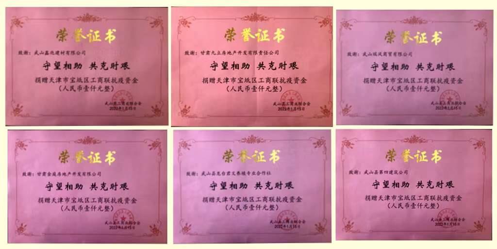 近日,武山瑞风商贸有限公司、甘肃金庭房地产开发有限公司、武山县龙台君义养殖专业合作社、武山县第四建筑公司、甘肃九立房地产开发有限责任公司、武山鑫兆建材有限公司等6家民营企业积极响应县委、县政府号召,踊跃捐款6000元,率先支援天津市宝坻区工商联疫情防控。