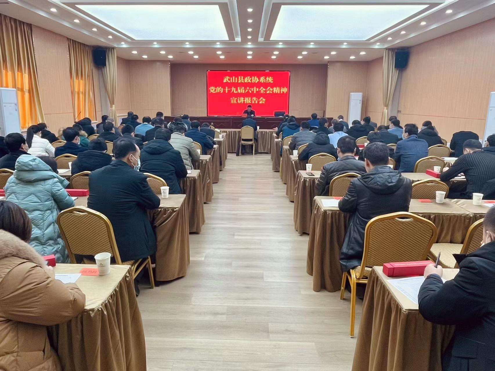 武山县融媒体中心 1月11日讯 (记者 杨耀斌)1月11日下午,全县政协系统学习贯彻党的十九届六中全会精神宣讲报告会在宁远大厦七楼会议室召开。县政协党组书记、主席庞明全作辅导宣讲,县委常委、统战部部长、县政协党组副书记李森主持报告会,副县长李峰,县政协副主席许鹏云、孟立瑞、邓红兵、党荣华、吴健明出席会议。县政协常委会组成人员,政协各参加单位和各乡镇委员工作站负责同志,各委员活动小组组长、副组长,住县市政协委员,县政协委员代表,机关干部职工共计90余人参加报告会。