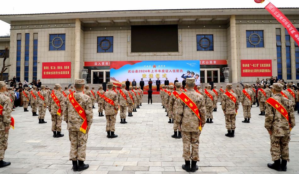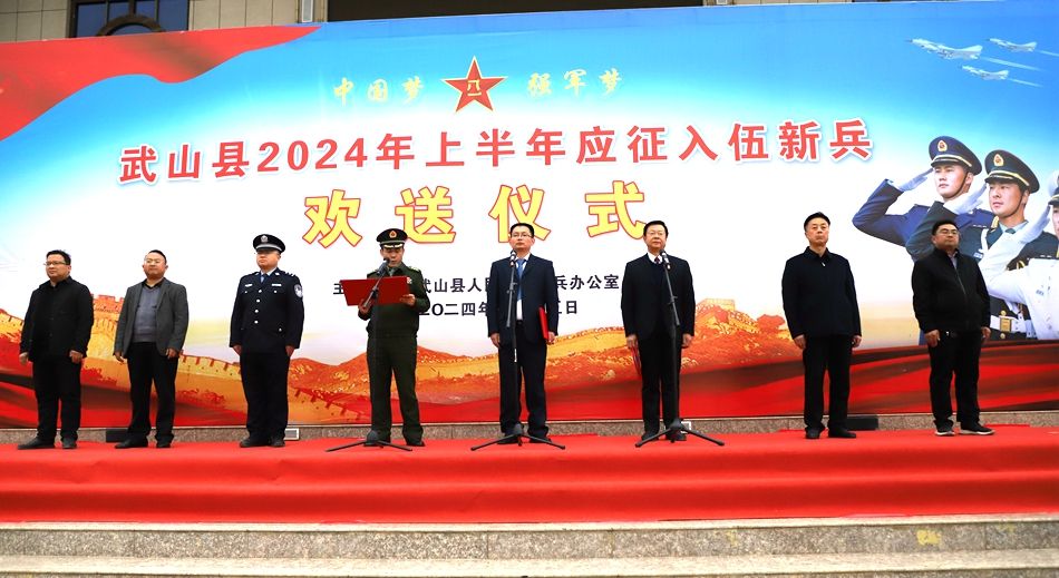 新武山讯(记者 杨洋)3月15日,武山县举行2024年上半年新兵入伍欢送大会暨出征仪式,热烈欢送74名武山儿郎奔赴火热军营。县委常委、副县长刘忠锋出席仪式并讲话,县人大常委会副主任郭海涛主持仪式,县征兵工作领导小组副组长、县征兵办公室主任、县人武部部长黄峰致辞。县征兵工作领导小组主要成员单位负责人、各乡镇武装部长、入伍新兵及新兵家属参加欢送仪式。