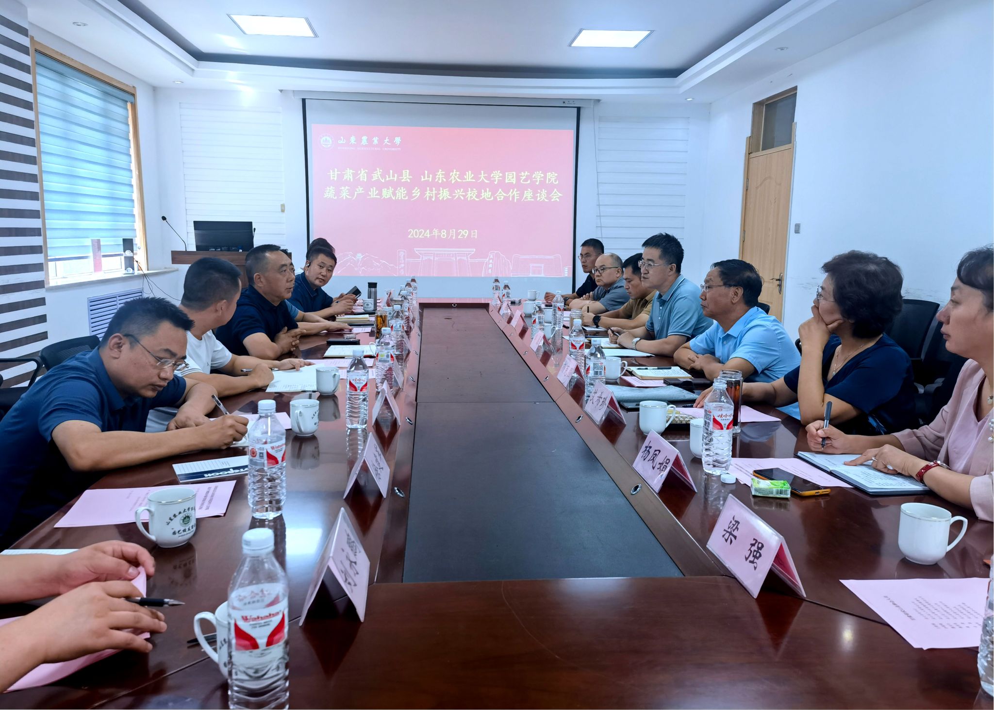 新武山讯 8月29日,武山县和山东农业大学园艺科学与工程学院蔬菜产业赋能乡村振兴校地合作座谈会在山东农业大学召开。县委书记王新强、山东农业大学园艺科学与工程学院党委副书记邹磊出席会议并讲话,县人大常委会主任孙德银、县直相关部门负责人及相关专家教授参加。