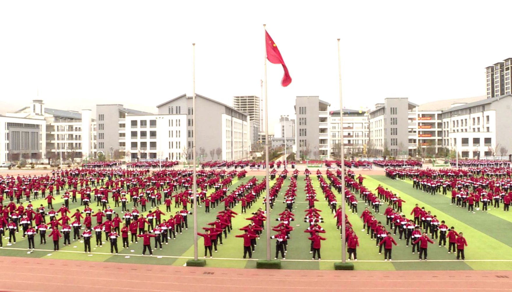 经典诵读结束后,便是本次活动的重头戏——武术操《英雄少年》展演。各班学生迅速按照课间操位置和队形站定,随着音乐的响起,学生们整齐划一地展示着一招一式,动作刚劲有力、规范标准,充分展现出武术操的独特魅力与青春活力。