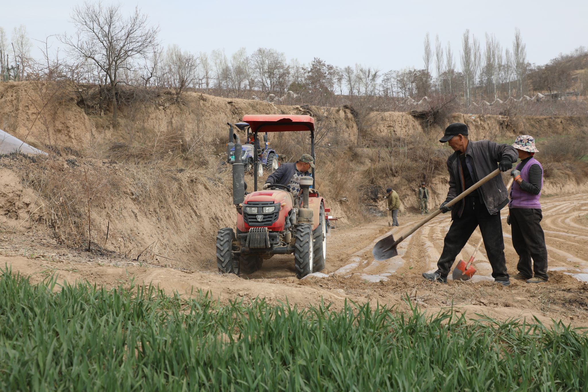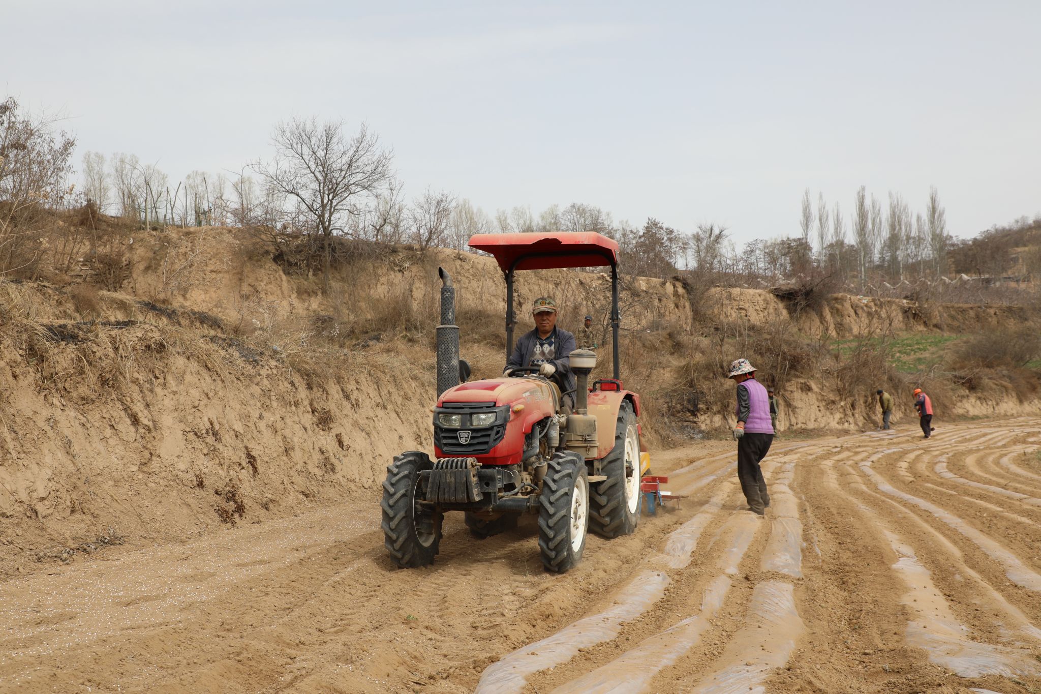 4月1日,走进温泉镇东梁村,村党支部书记夏荣学正组织群众覆膜。田地间,覆膜机轰鸣,走过翻熟透的土地,地膜就整齐覆盖住土壤,换上了“新装”;对于机器到不了的地方,群众手工覆膜,与覆膜机一较高下。