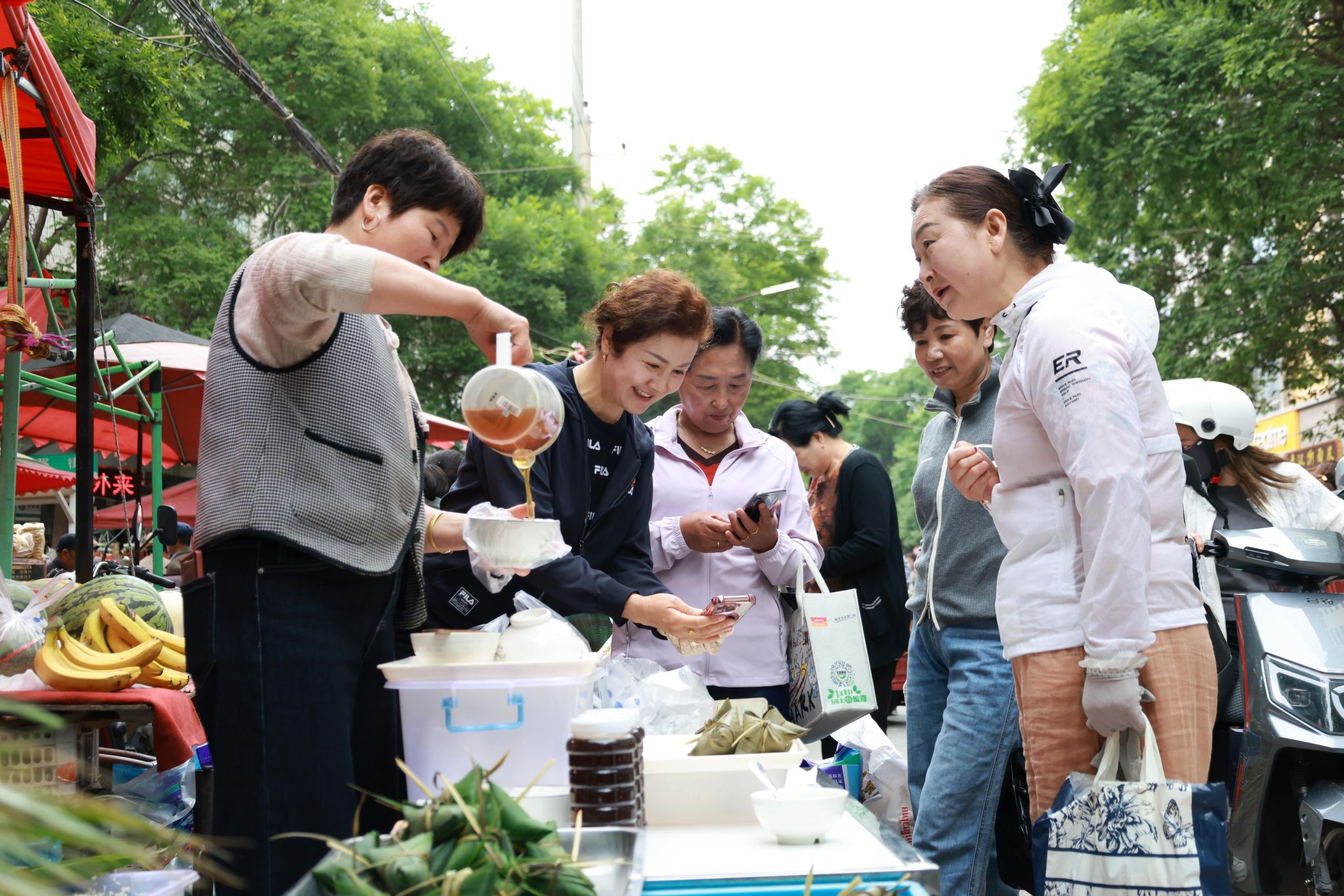 清晨的市集上,赵阿姨的粽子摊位前人头攒动,她手指翻飞间,青翠粽叶裹着糯米与红枣、葡萄干等馅料迅速成型。“武山甜粽用本地土蜂蜜调味,软糯清甜,端午期间每天能卖出五六百颗,真空包装发往外地的订单也络绎不绝。”赵俊芳笑着介绍。