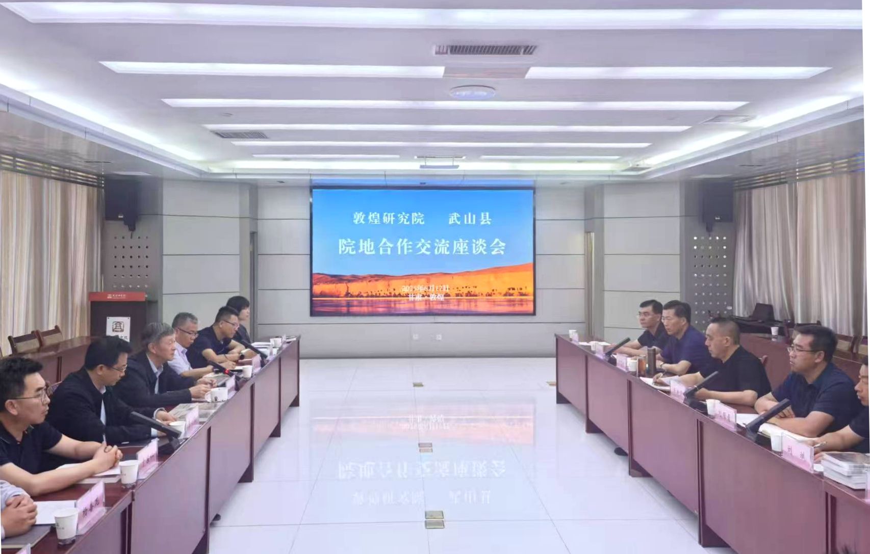 考察中,王新强一行通过实地观摩、座谈交流,详细了解了敦煌研究院在文化保护、文化创意和活化利用等方面的前沿做法。座谈会上,与会人员一同观看了《十有武山美名扬》专题片和《武山摩崖石窟文化旅游风光片》,相关人员介绍了武山县经济社会发展和摩崖石窟文化旅游区情况,并围绕石窟文化研究保护、文化资源利用、文旅融合发展等方面进行了交流。